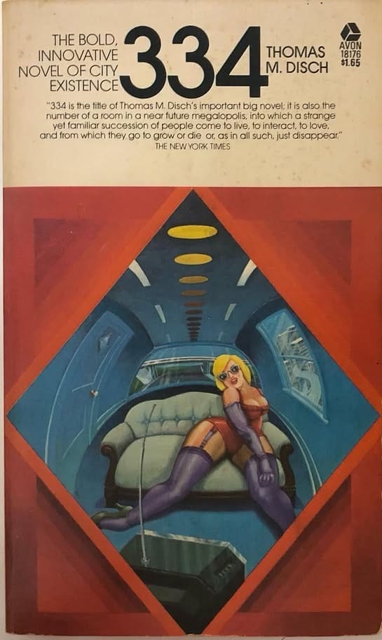 In third place is the final big sci-fi novel set in 2025: Thomas M. Disch's 334, published in 1972. My favorite cover is the Tony Roberts artwork for the 1974 edition: Simple and focused, with limited color and a reliance on shadows.