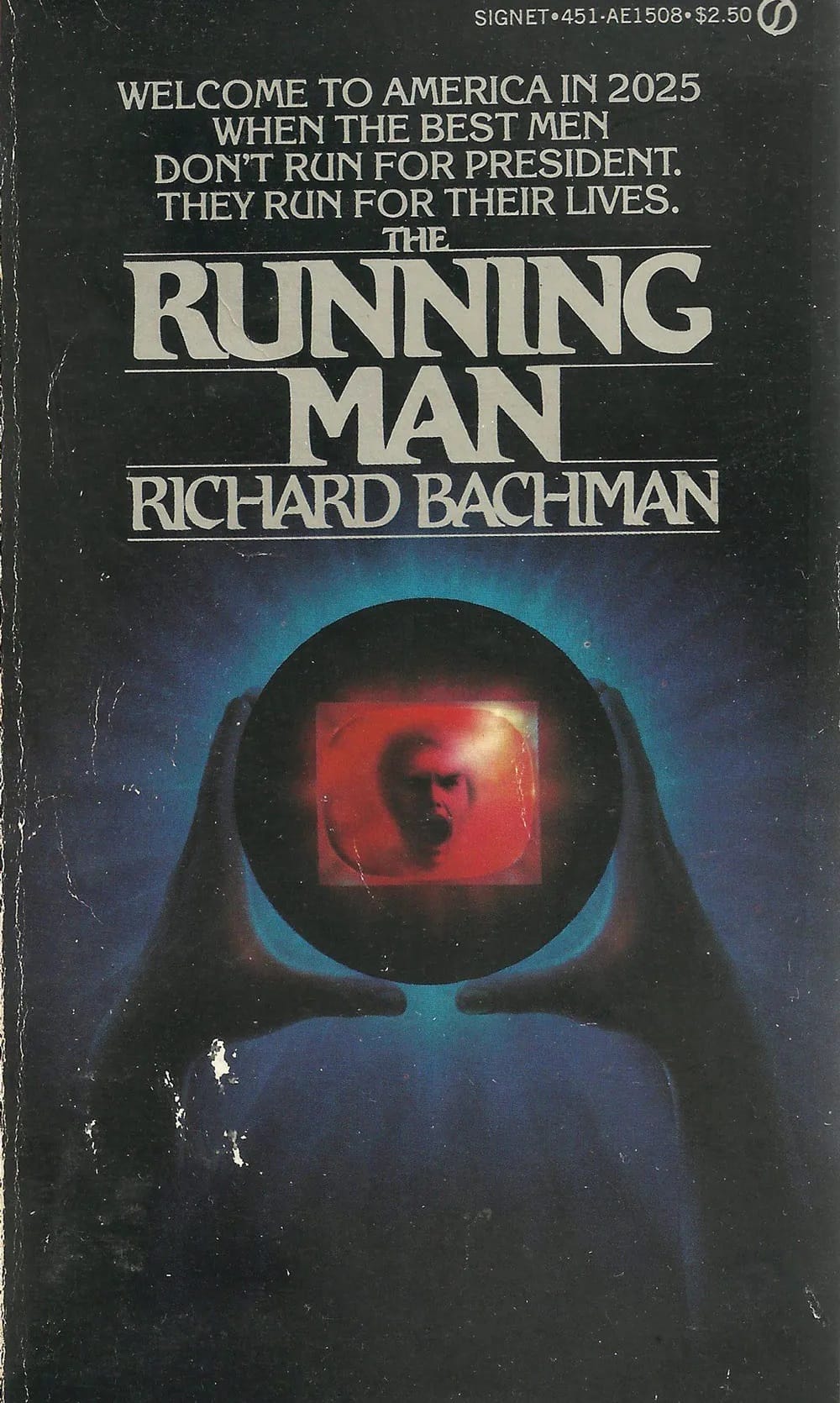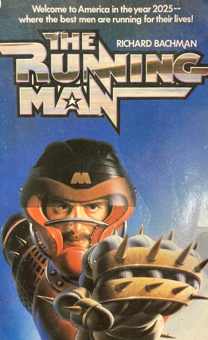 Second place goes to the 1982 first edition of The Running Man, written by Stephen King as Richard Bachman, and it's impressive tagline.