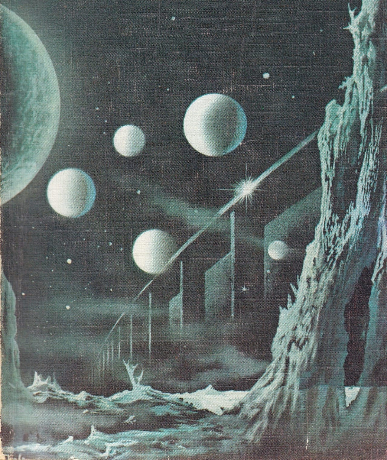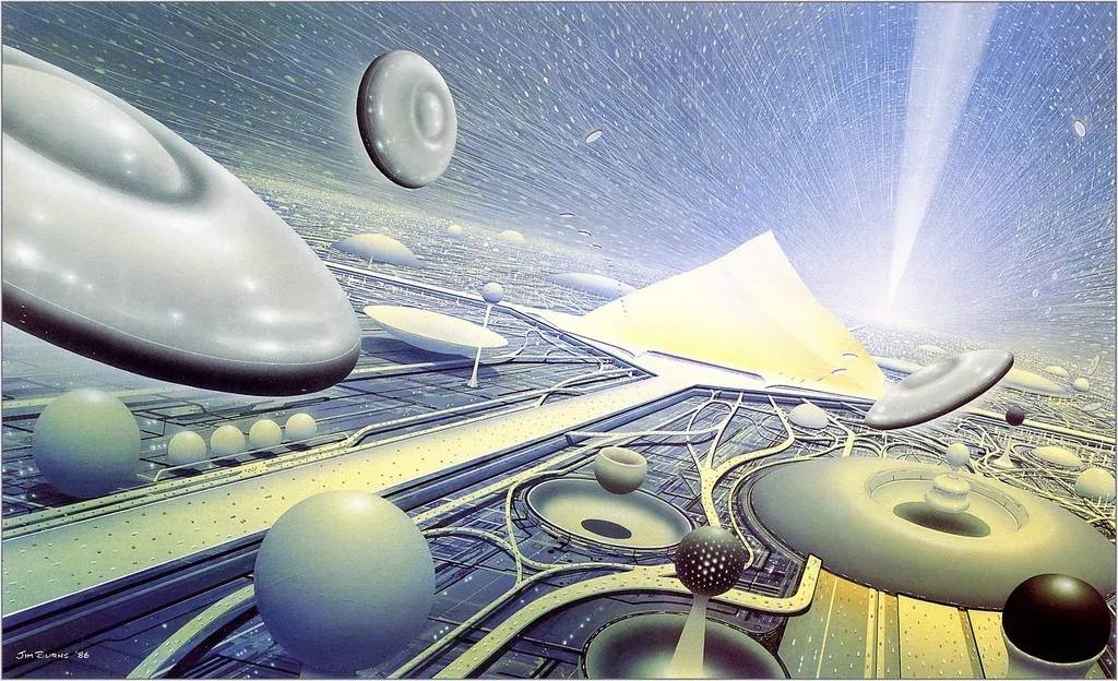 Jim Burns' 1986 cover for Greg Bear's Eon, featuring the ground side of the Hexamon Nexus (at least according to this commenter).