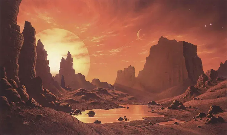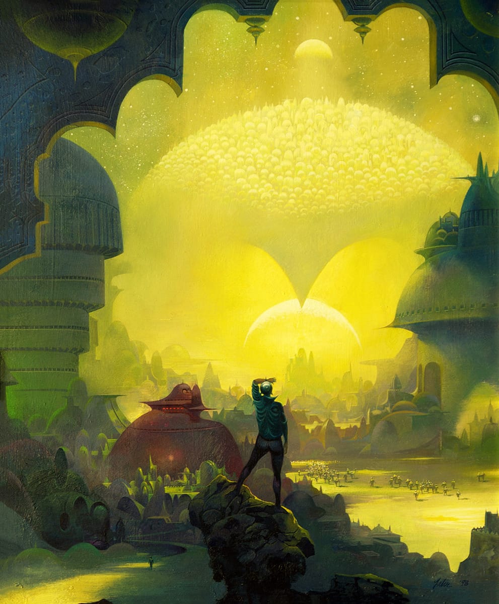 Detours into the tiny corners of science fiction art history are great for learning more about gas masks or vikings, but sometimes we need to take a beat to appreciate the basics: Gorgeous planetary scenes with forbidding towers, glowing pyramids, and two purple suns.