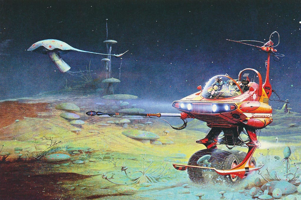 Finally, "Omnivore," 1976, by Peter Andrew Jones, features a fun vehicle. Wonder if it's gyroscopic? Scan from Retro Sci-Fi Art.