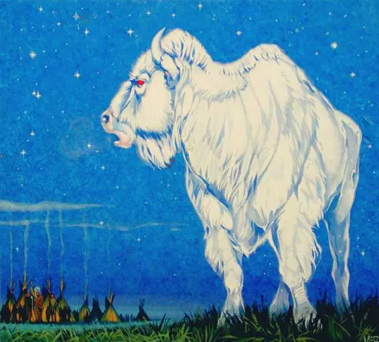 This white buffalo is a similar one. It's one of the few fairly normal animals here, an American bison with white fur that is sacred or spiritually significant in several Native American religions. McBride adds red eyes that give the entire scene a ghostly vibe.