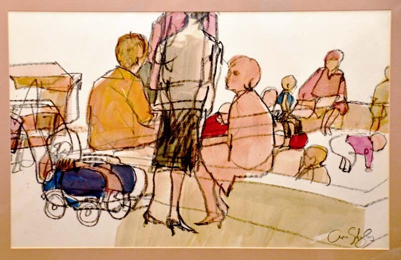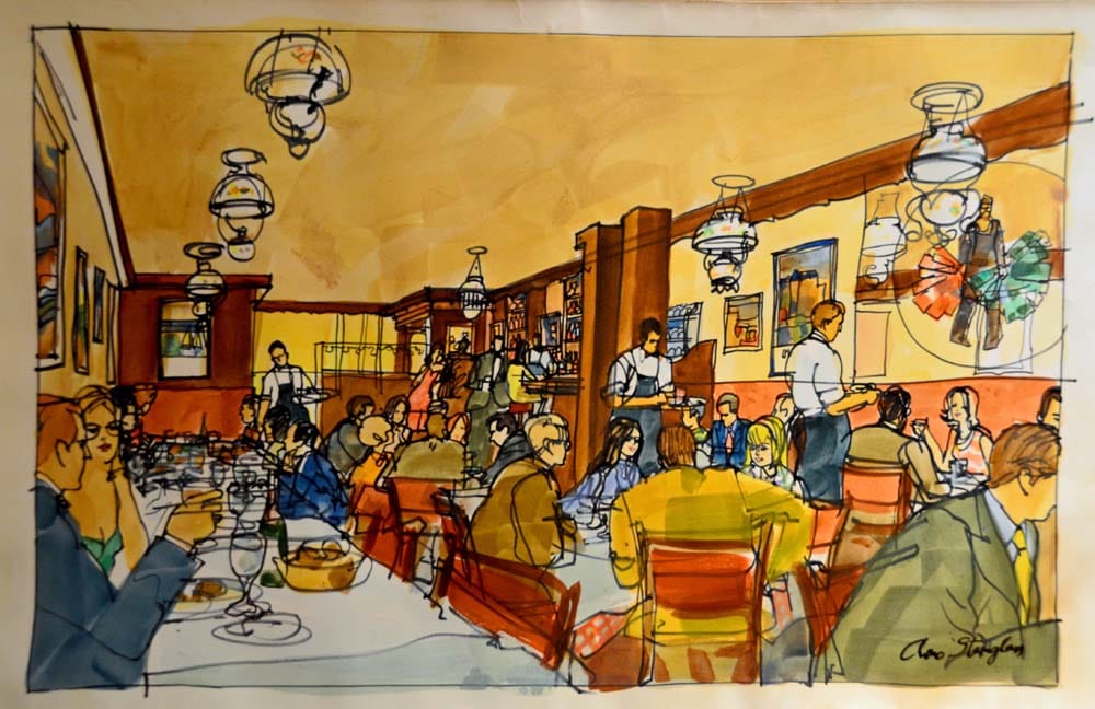 The scene is a cafe on Third Avenue in Manhattan where Arno and his wife Lila liked to eat. In exchange for some meals, Arno made this painting for the owner in 1971. The owner gave Arno more credit than he had expected. So β and this is typical Arno and Lila β they decided to celebrate their 15th wedding anniversary at the restaurant and invited 3 couples to join them. Lila says, "We all enjoyed a fine meal and drank a lot of wine."