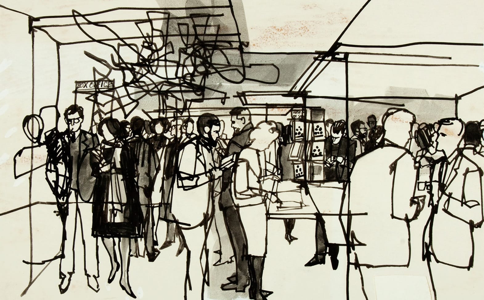 Here's an interior illustration for an article titled "The Living Theatre," published in the March 1962 issue of Horizon. The original sold in 2014 for $50.