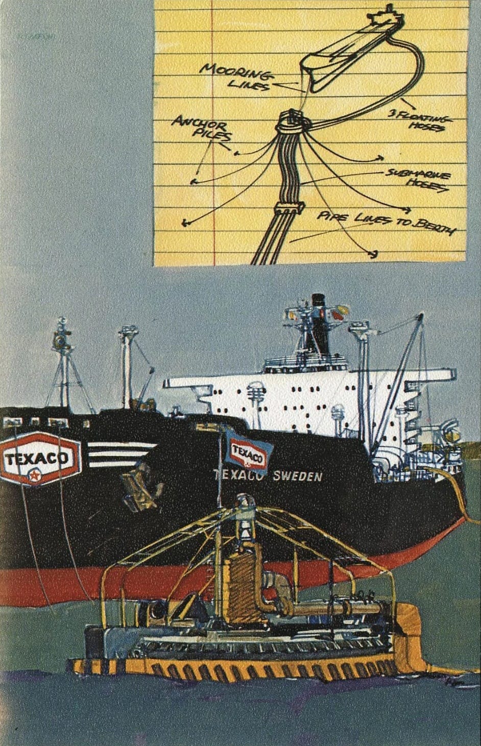 Here's a Sternglass illustration for a Texaco Crude Oil Tanker loading or unloading oil to a floating contraption. The tanker was built in 1972, and scrapped at Kaohsiung Taiwan in 1982, according to the eBay posting I found this on.