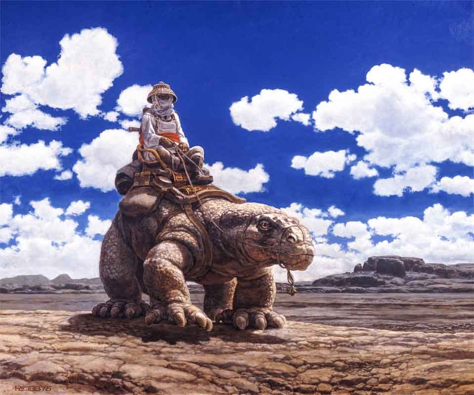 "When I was doing the aliens for the Cantina scens in Star Wars, I looked at some of the stills of the stuff they shot in Tunisia, and suddenly I came to this picture of a stormtrooper sitting on the back of a big lizard and it looked an awful lot like a painting I did for John Milius, almost the same pose and everything. Strange! I didn't think anything of it, just a coincidence, and then many months later I was talking to Milius and he sais, 'Your lizard - my paintings's in Star Wars. Lucas was up here one night and he saw it and said he wanted to try to put it in Star Wars.' They started to build the lizards, but they were only able to build the upper part, they weren't able to build the legs. They ended up with camel-like legs whereas mine had great big iguana-like legs. I just made it up."