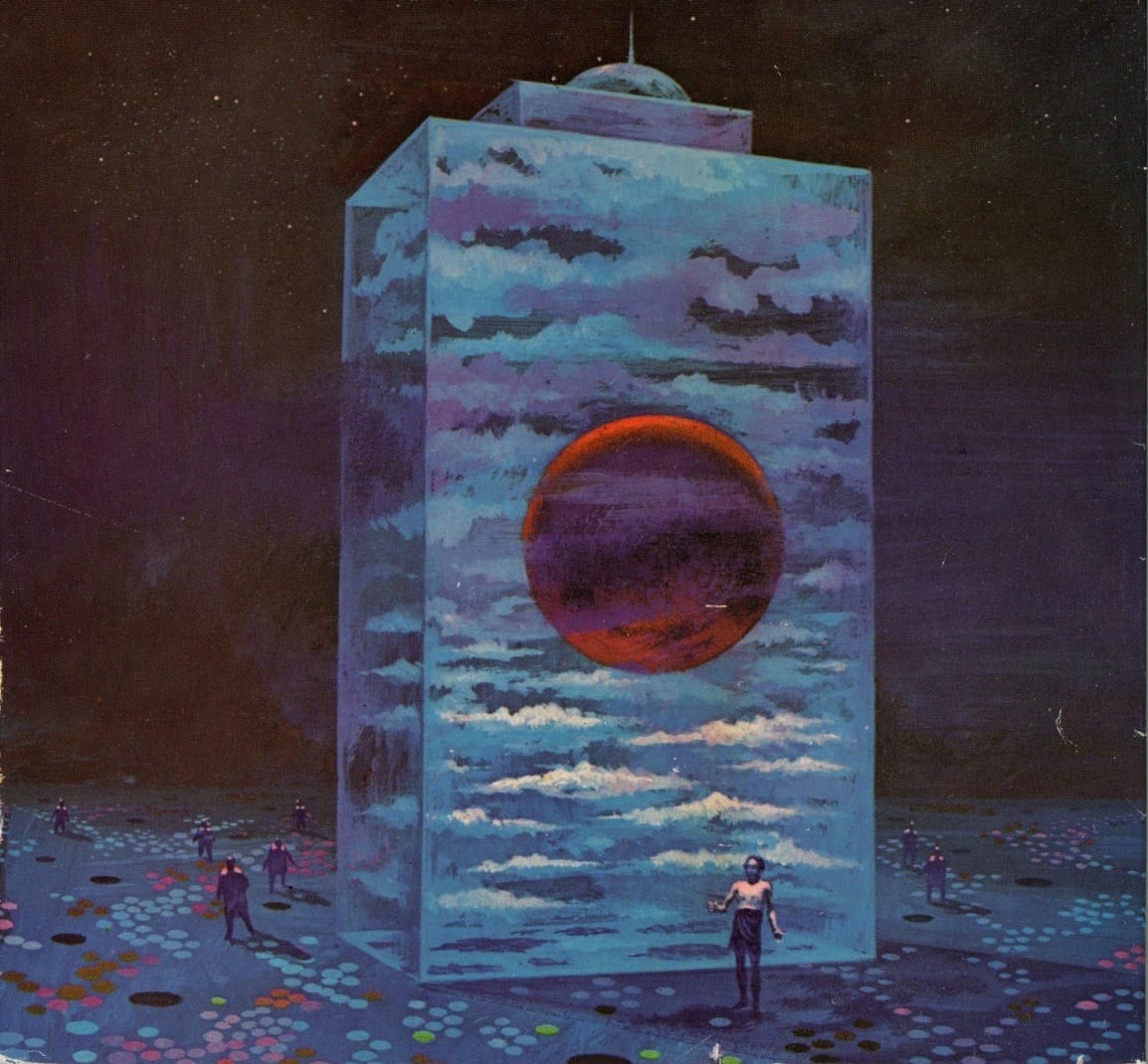 Here's a blue sky trapped inside a building, done by Paul Lehr for a Harry Harrison-edited 1973 anthology, SF: Author Choice 3.