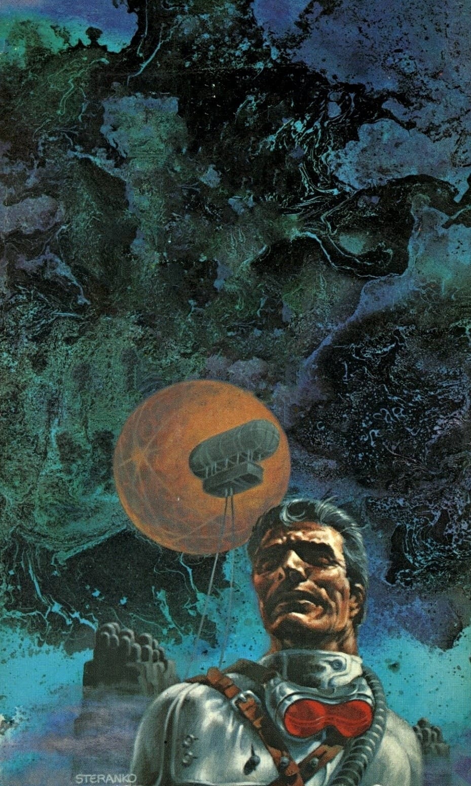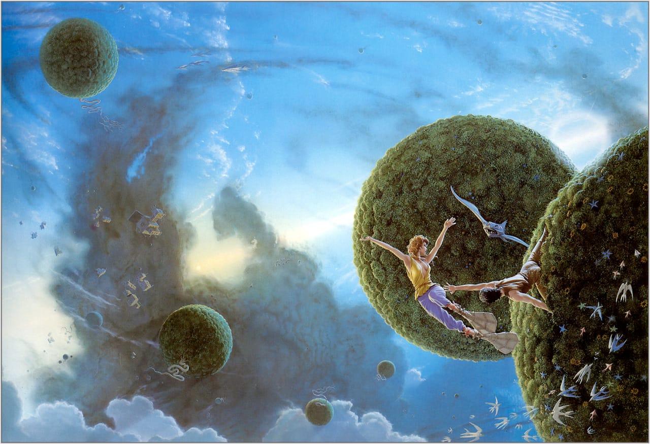 I'm not quite sure what's happening on Luis Royo's 1989 cover art for Look into the Sun by James Patrick Kelly. The story apparently focuses on an architect with a grand project to create "an immense floating cloud" which is then co-opted by aliens, so this is probably Royo's impression of that project.