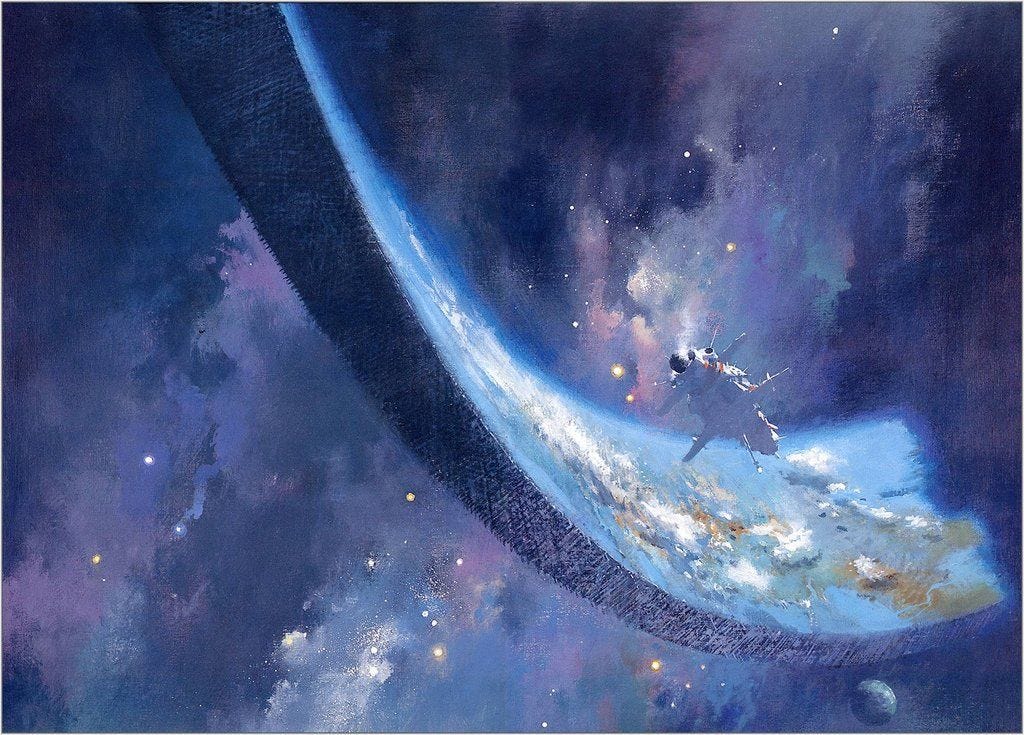 Page 85: John Harris’ pastel 1996 cover to The Ringworld Throne intentionally shows Ringworld while still under mega-construction in order to make it easier to fit into the painting.