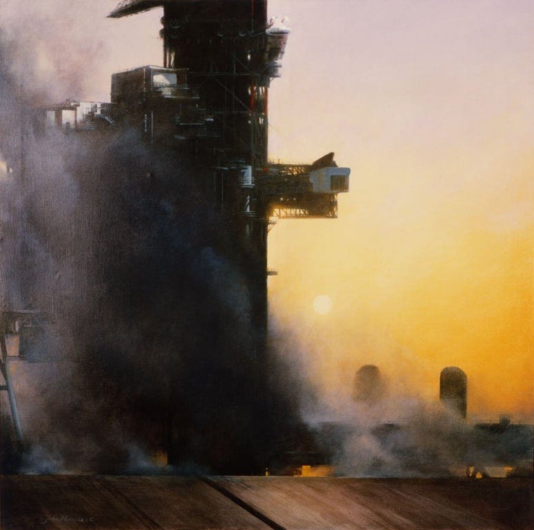 Page 81-85: NASA invited Harris to see a launch of the Discovery in 1985 as part of a program to get artists to document NASA’s work. Harris was the first British artist comissioned by NASA. Harris made an unusual choice that the Mass book doesn’t really dwell on: He painted the empty, smoke-swept launchpad 60 seconds after the shuttle had left it. It’s a more wistful, meditative vision of NASA than you’ll see from, say, Robert McCall, who worked with the same NASA program.
