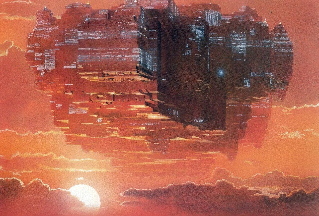 Like Robert McCall, Harris painted a few works in which “gravity-free engineering” had been invented in the future. It’s because flying cities look cool (citation needed).