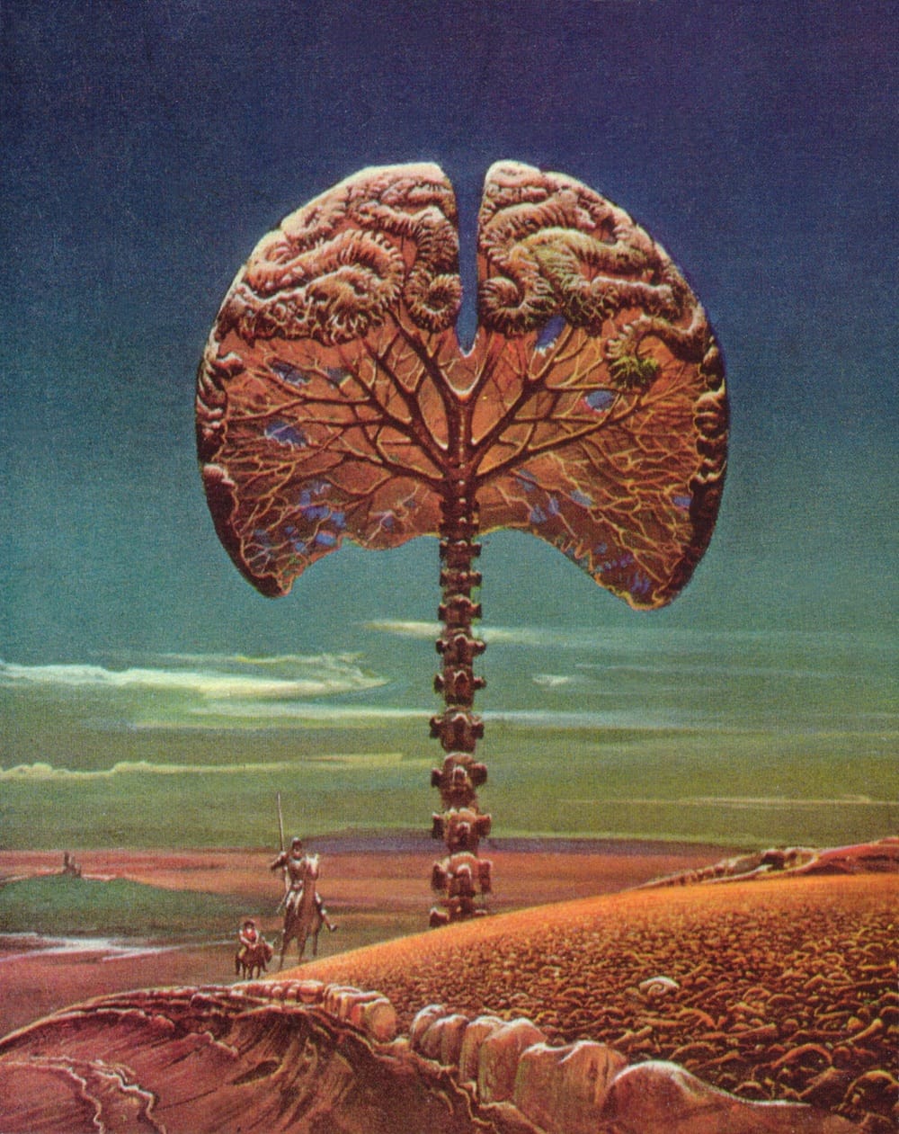 There's a lot going on with this 1973 Bruce Pennington cover for Out of Their Minds, by Clifford D. Simak. It not only centers around a spine-trunked brain-tree, but it even features a ridge of teeth that Don Quixote and Sancho Panza are riding alongside. How's that for a sentence that's no one has ever said before?