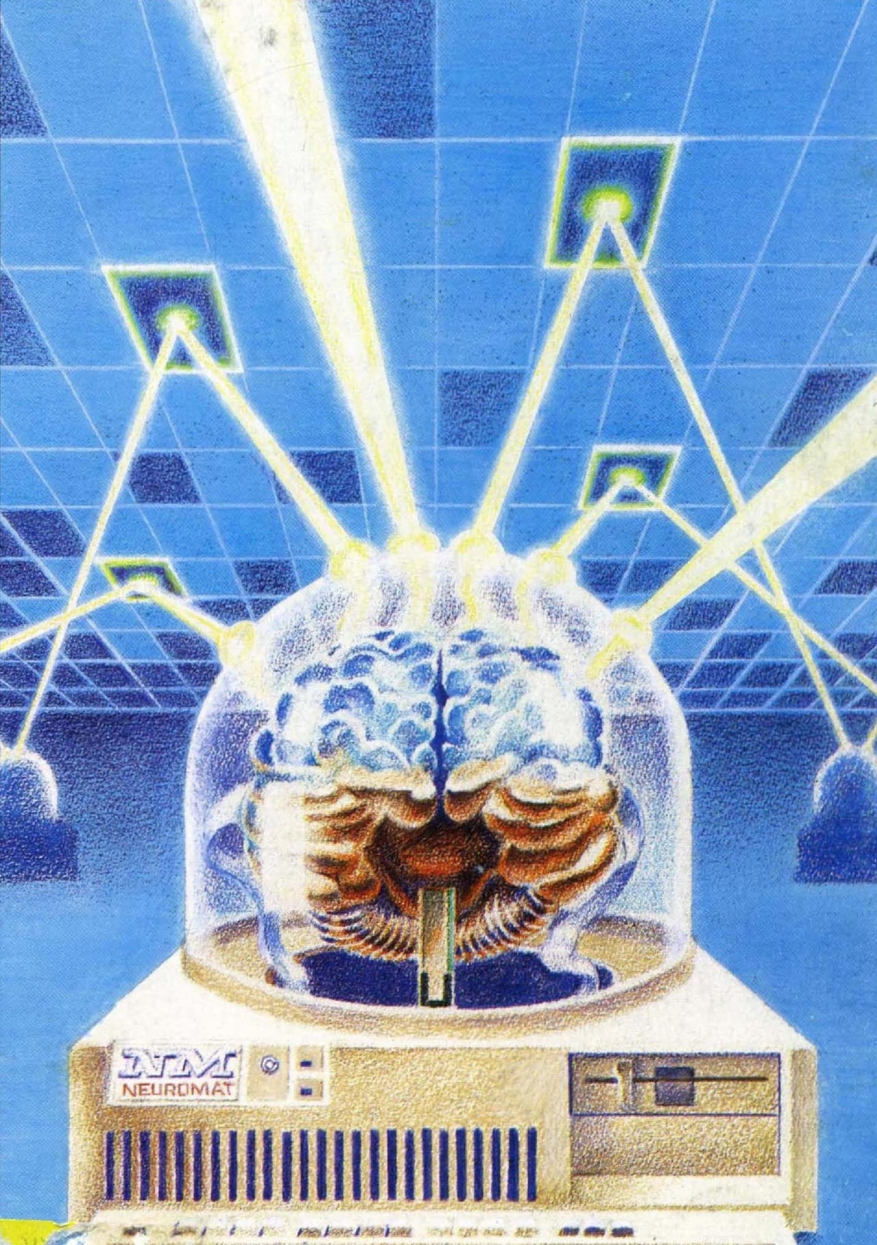 The brain-as-artificial-intelligence idea shows up in tech magazines, too. Paul Leatherwood's 1988 cover art for Micro Cornucopia #41 illustrates an article on the neural networks that are "modeling human reasoning."