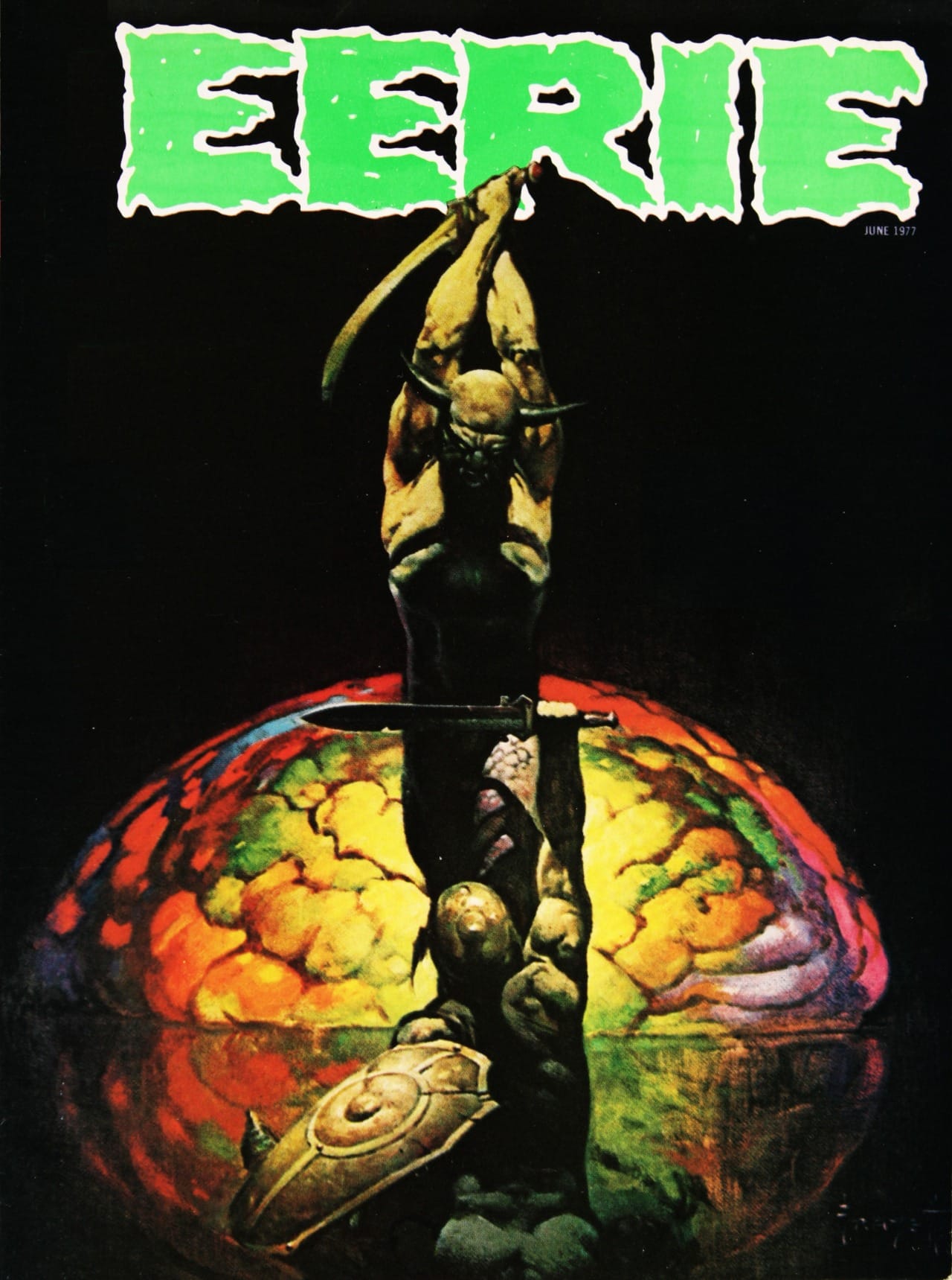 Demons battle over a rainbow brain on this 1977 Eerie cover by Frank Frazetta.