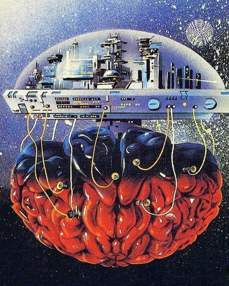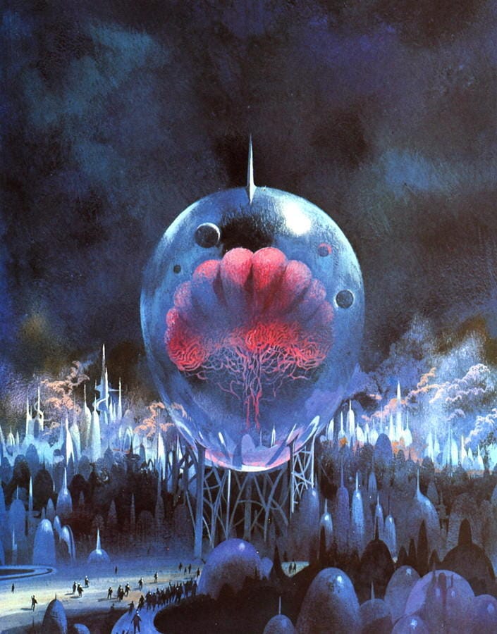 Artists can get a lot of symbolic mileage out of brains, particularly within the science fiction genre. Check out this city literally built on human intellect, done by an uncredited artist for a 1988 cover to the Polish translation of Men Like Gods, by H. G. Wells.