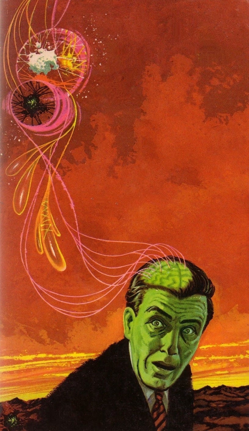 Ralph Brillhart's 1963 cover to J. Hunter Holly's The Running Man has a half-exposed brain, along with some creepy surrealism spilling out.