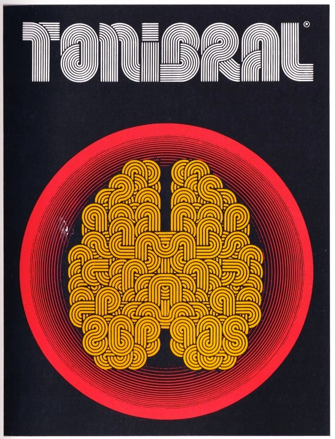 Here's a 1970s pharmaceutical ad from Argentinian graphic designer Eduardo C. Cánovas, depicting a human brain.