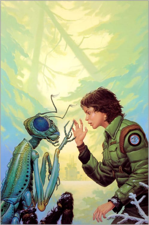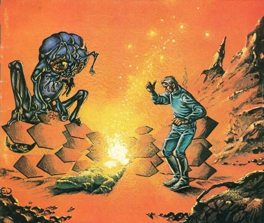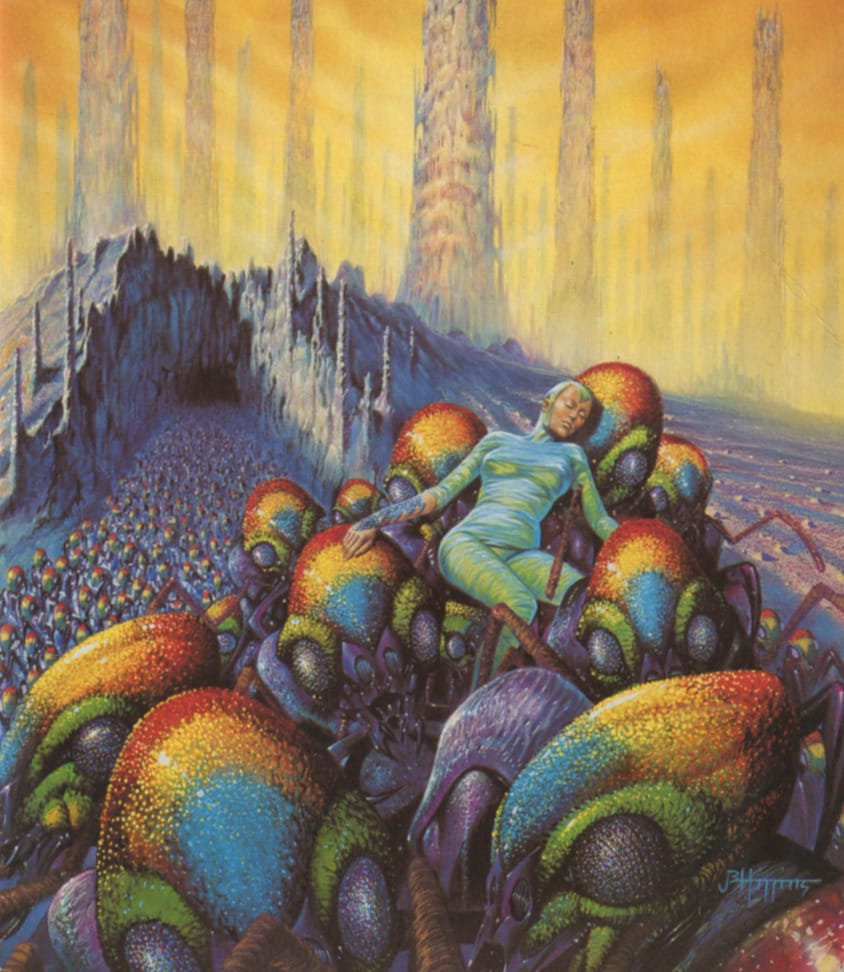 Not sure what the bugs on this 1989 cover art by John Higgins for C. J. Cherryh's Serpent’s Reach are up to.