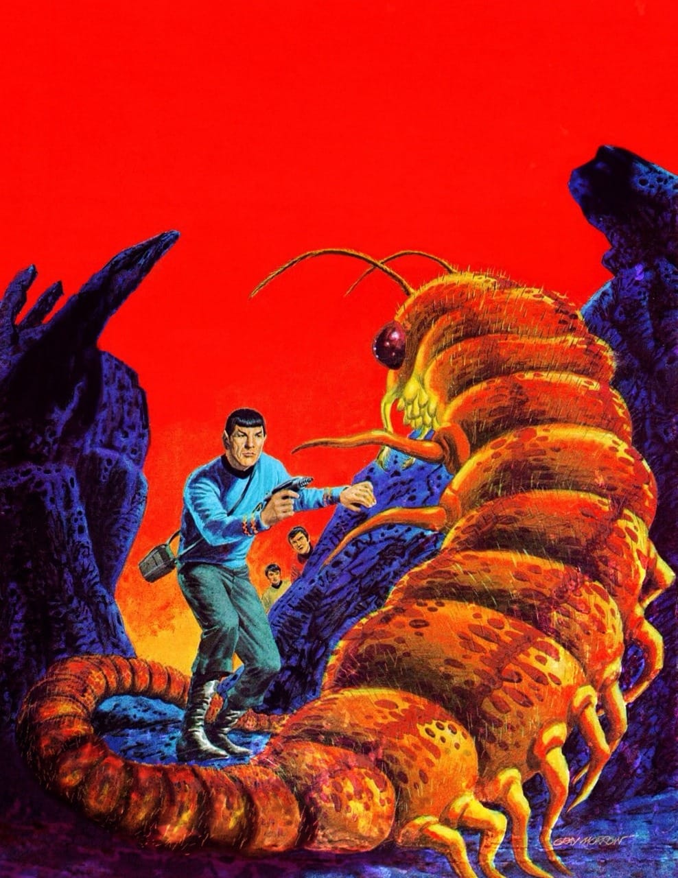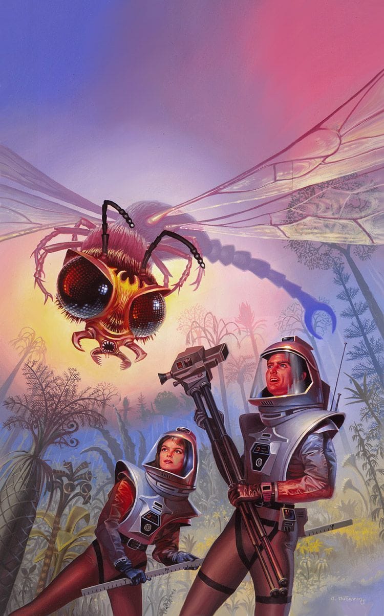 Anyway, that's enough about that illustration. Let's take a look at all the other times bug-like aliens have messed around with humans in retro sci-fi art.