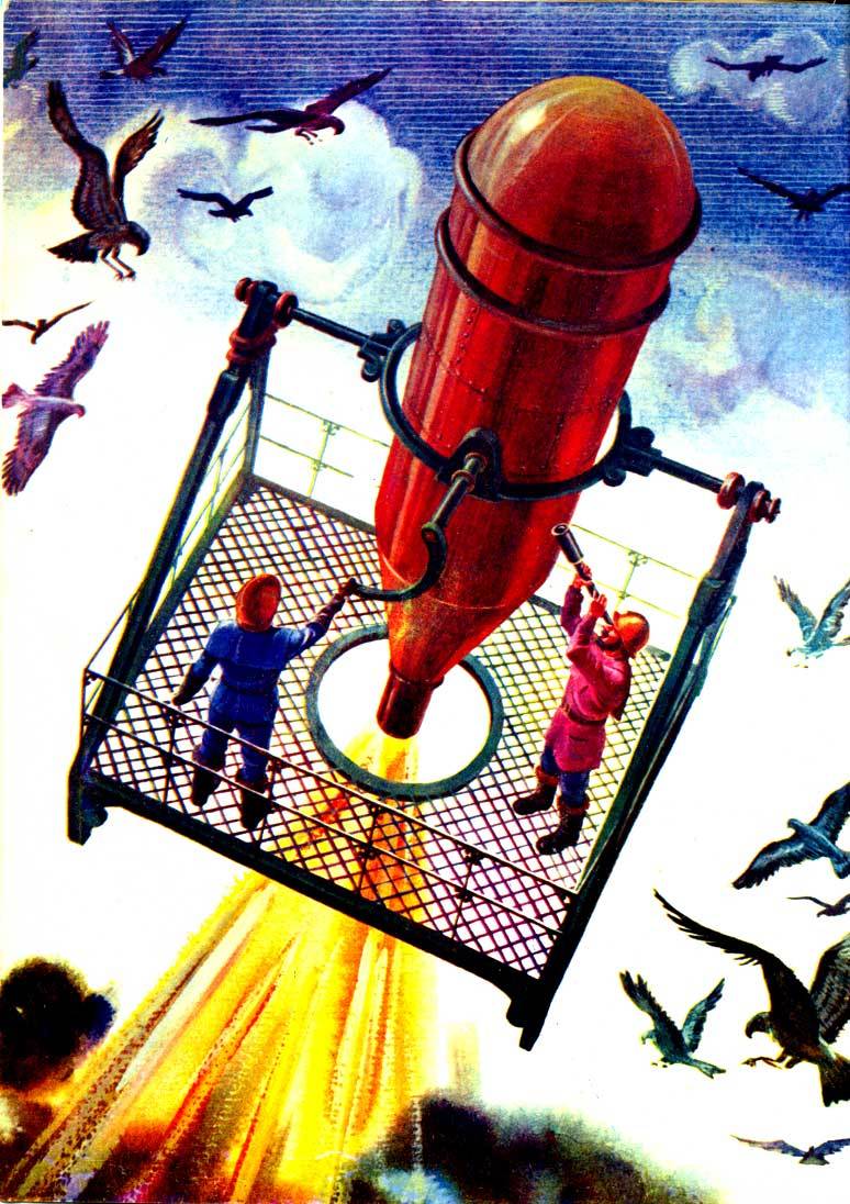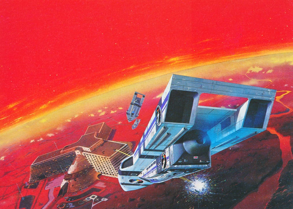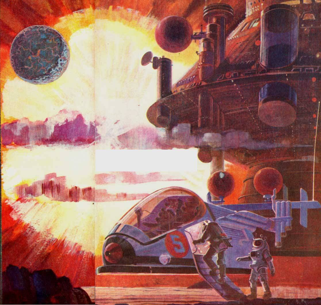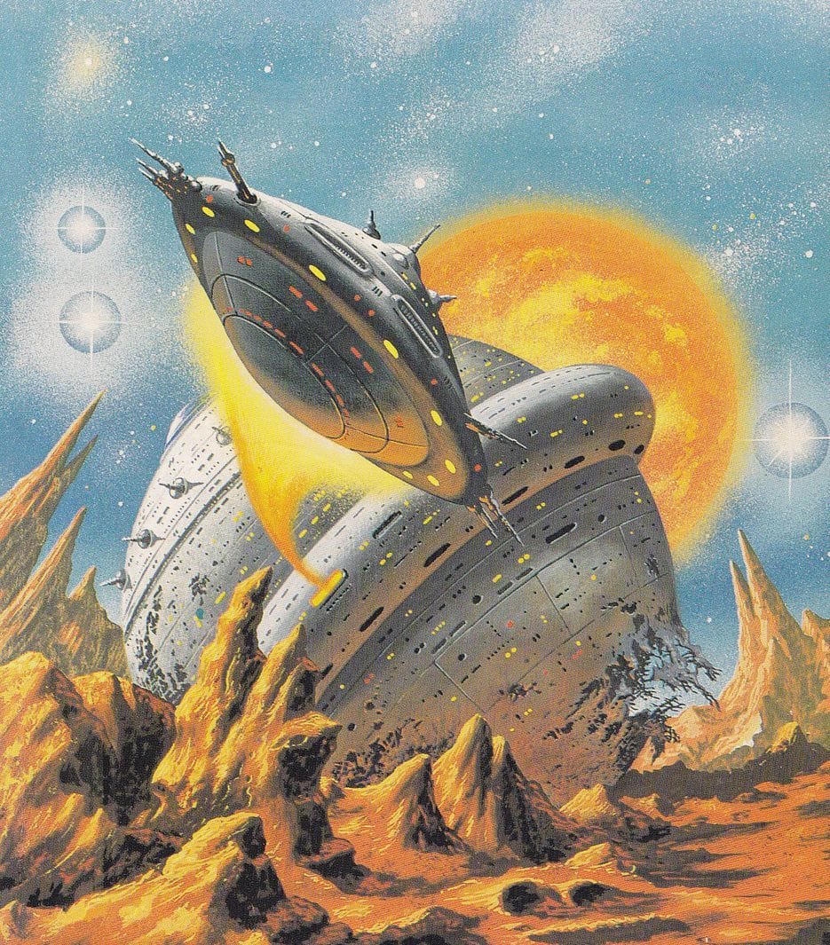One lesson to learn from those two images: If the background is red, the spaceship is blue. Blue and yellow are a great contrast as well, though. Here's an Alfred Kelsner.