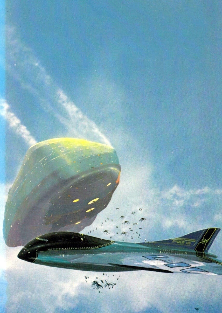 It's actually a little outside his norm, since the spaceship looks more like an airplane and it appears to be jettisoning spores. It still has the classic Foss iconography on the wings and tail, though: Incomprehensible industrial markings that look like an alien language.