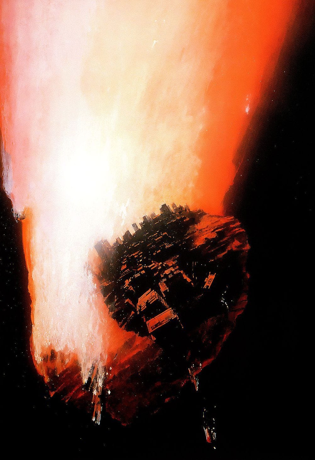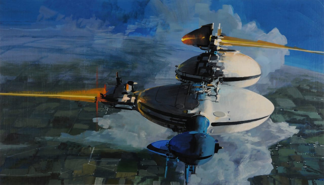 Here's one from the king of '70s-'80s American spaceship illustrations, John Berkey. This one's called "Single Ship" on his website, where the original is on sale for $7,000.