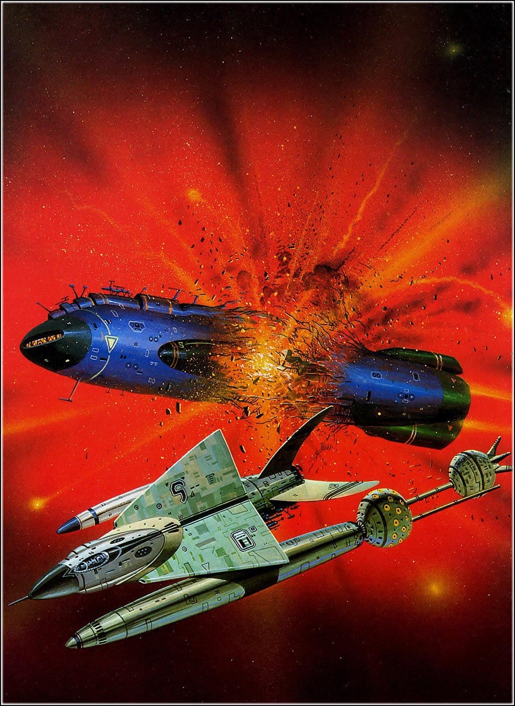 That's an Angus McKie, created for the 1978 cover of Nebula Award Stories 11 edited by Ursula K. Le Guin, and re-used a year later for Stewart Cowley's Great Space Battles collection.