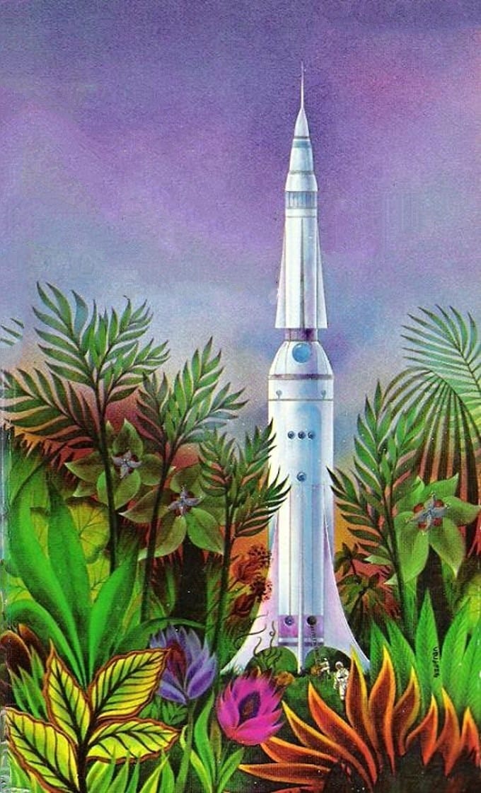Some artists stuck to the classics: Here's a spaceship that looks pretty clearly based off of a Saturn V rocket, done by Gene Szafran for the 1973 cover to All the Gods of Eisernon, by Simon Lang. The real attraction is the delightfully lush alien planet surrounding the ship.