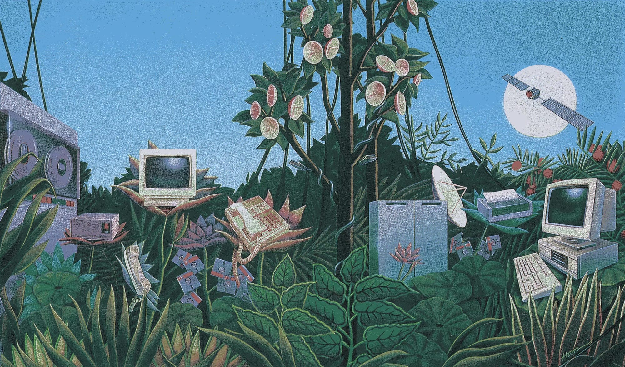 A similar tome of coffee table illustration, 1986's Corporate Showcase 5, includes this one by Jeanette Adams. I'm cheating because this is clearly an animal-based computer, not a plant-based one.