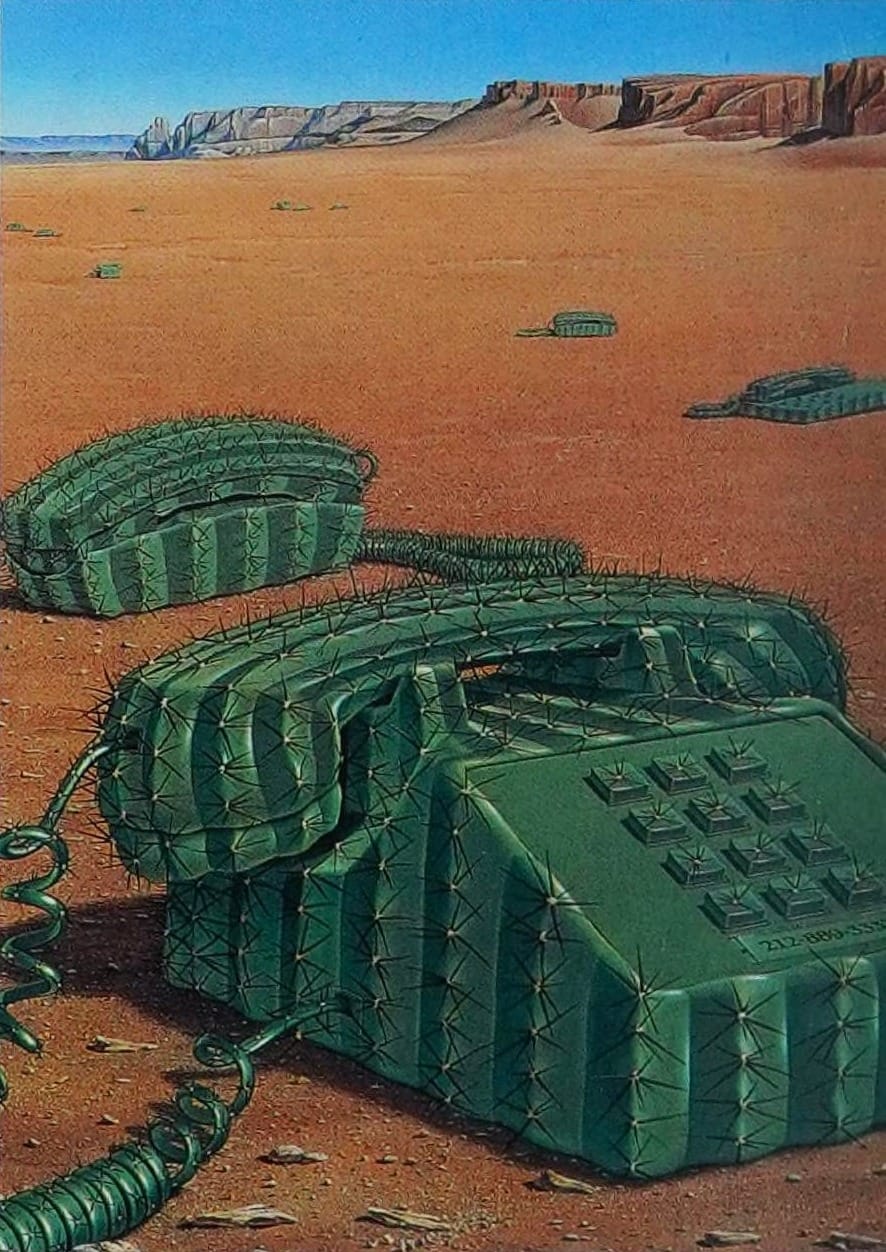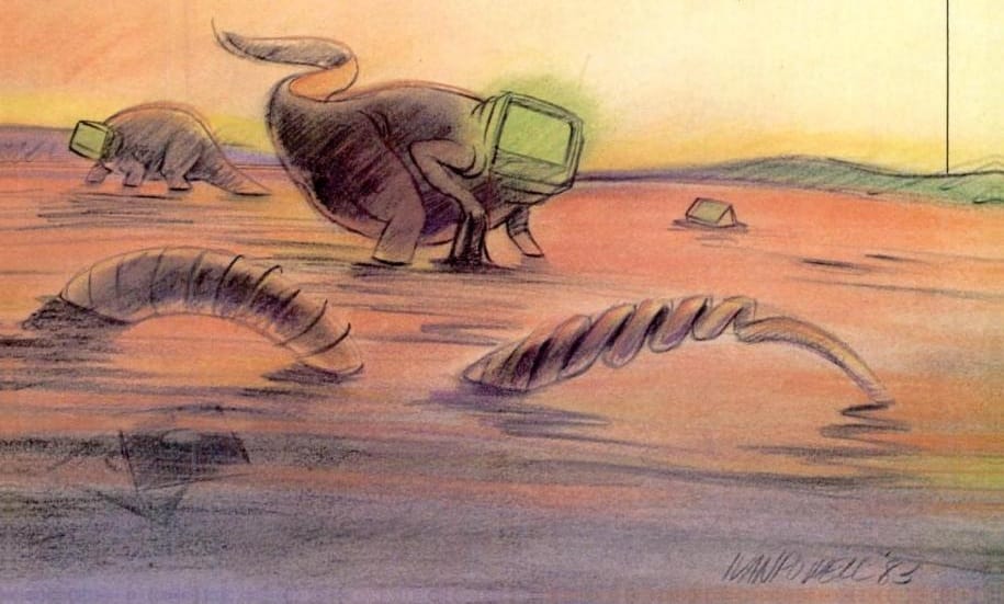 At least the dinosaur computers in these 1983 Ivan Powell illustrations are accompanied by floppy disk foliage. I love the eerie green glow.