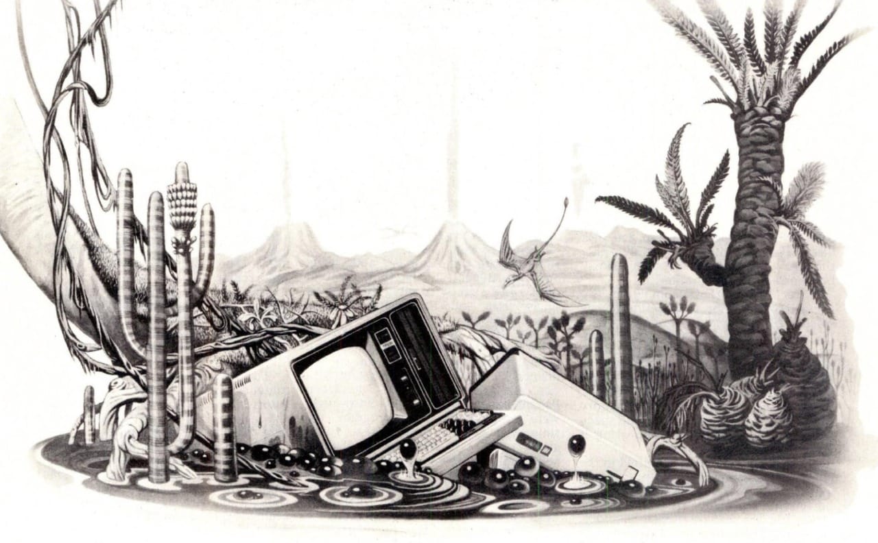 "Thе Commodore РЕТ offers you а safe passage through the primeval swamр of computerization," says the ad copy accompanying this uncredited illustration in a June 1981 issue of Personal Computer World: