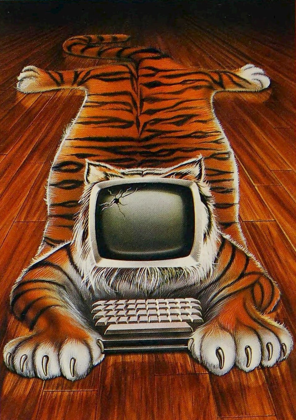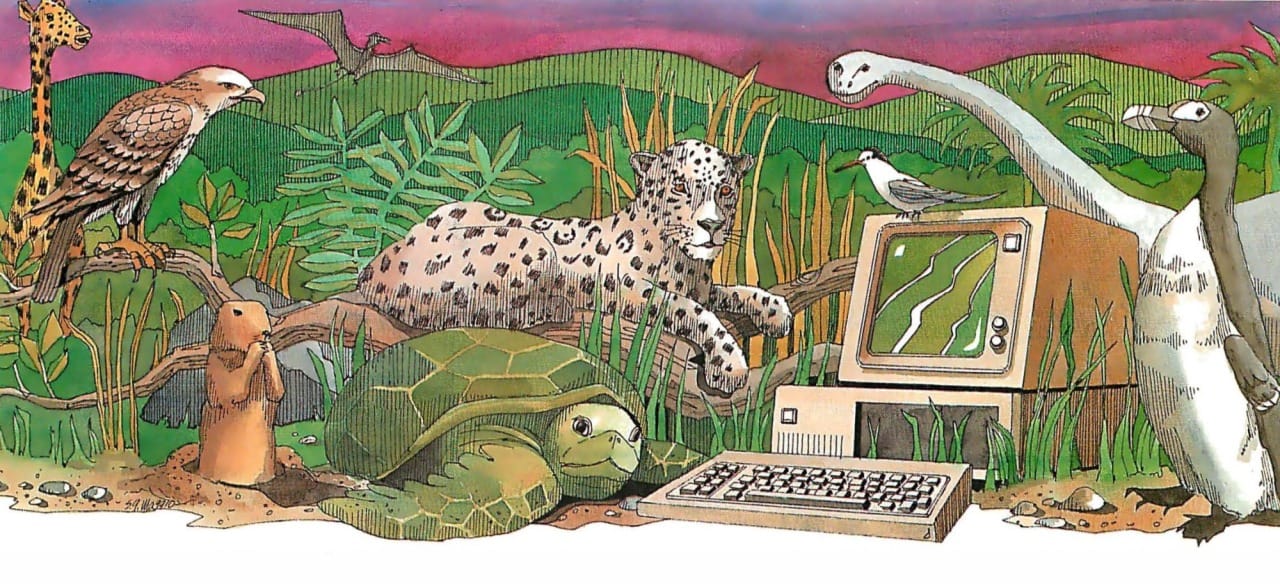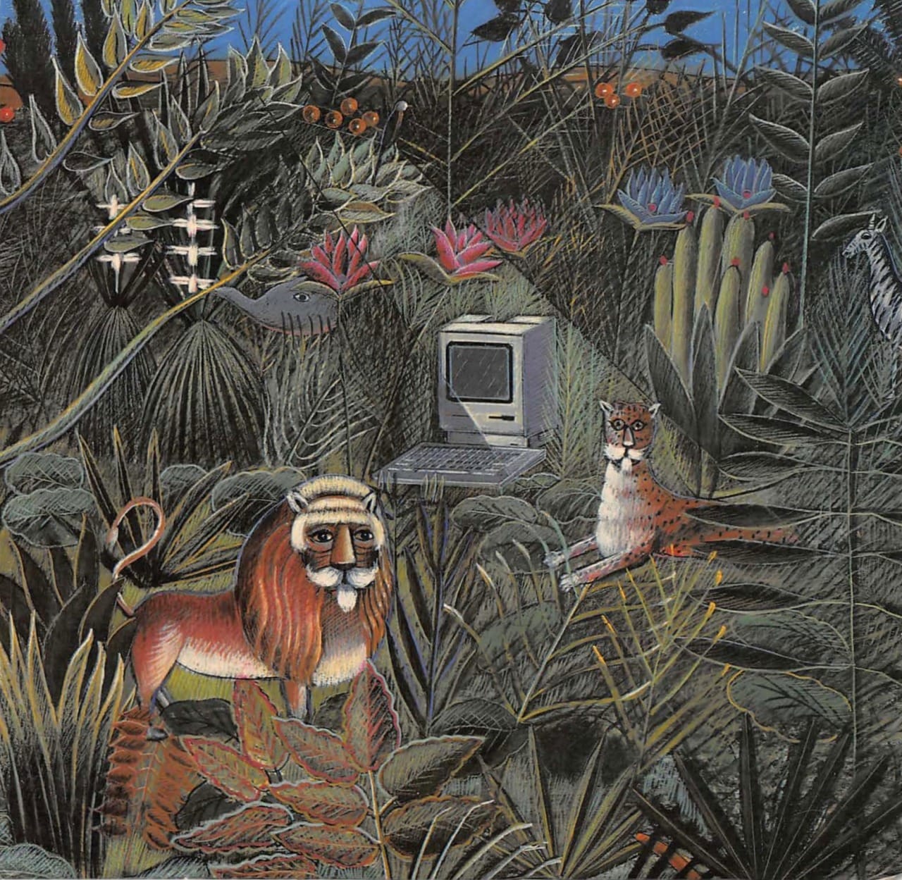 Take the 1989 cover to Exploring Macintosh: Concepts in Visually Oriented Computing for example. The uncredited artist reimagines computer lessons as a safari, homaging the style of French post-impressionist Henri Rousseau by copying both the jungle setting that Rousseau frequently painted and Rousseau's intentionally flat "primitive" style.