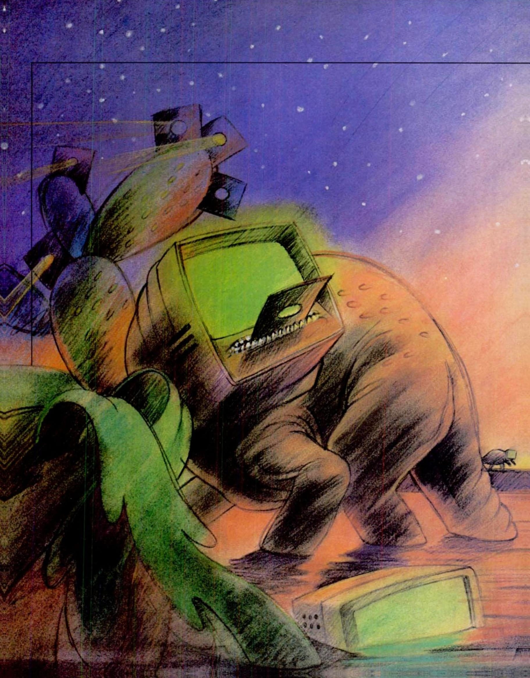 Before we start, though, I should mention that, much like my Medieval Computers post, this roundup couldn't exist without the efforts of art blogger Lookcaitlin, who has spent years spelunking the depths of the Internet Archive for the best '70s-'90s retro tech magazine illustrations.