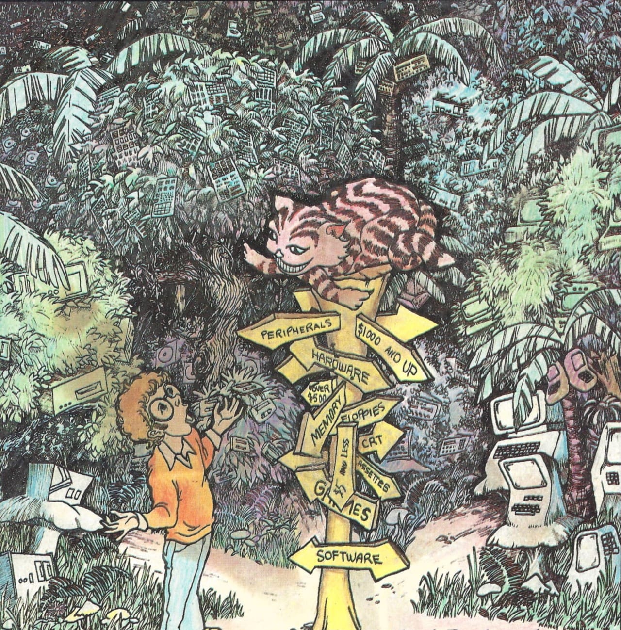 We can't talk about visual puns in retro tech illustration without Robert Tinney popping up. He's known for his era-defining run of Byte magazine covers, but I'm equally fascinated by his work for other computer magazines.