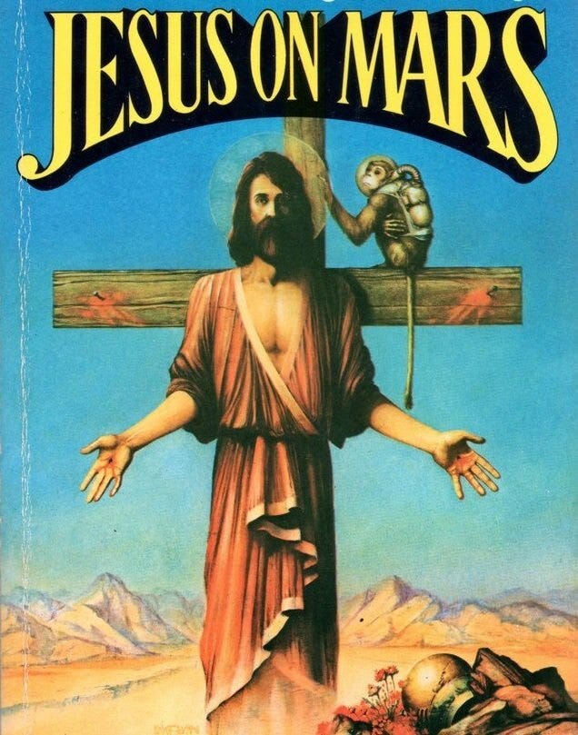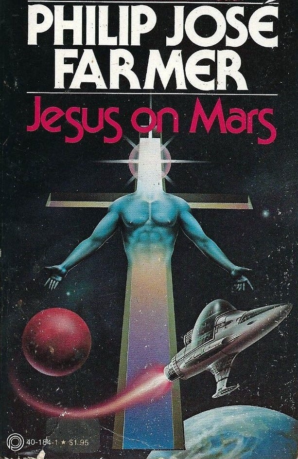 Plus there’s the Philip José Farmer book Jesus on Mars. Here’s Paul Stinson’s 1979 cover and Melvyn Grant’s 1982 cover.