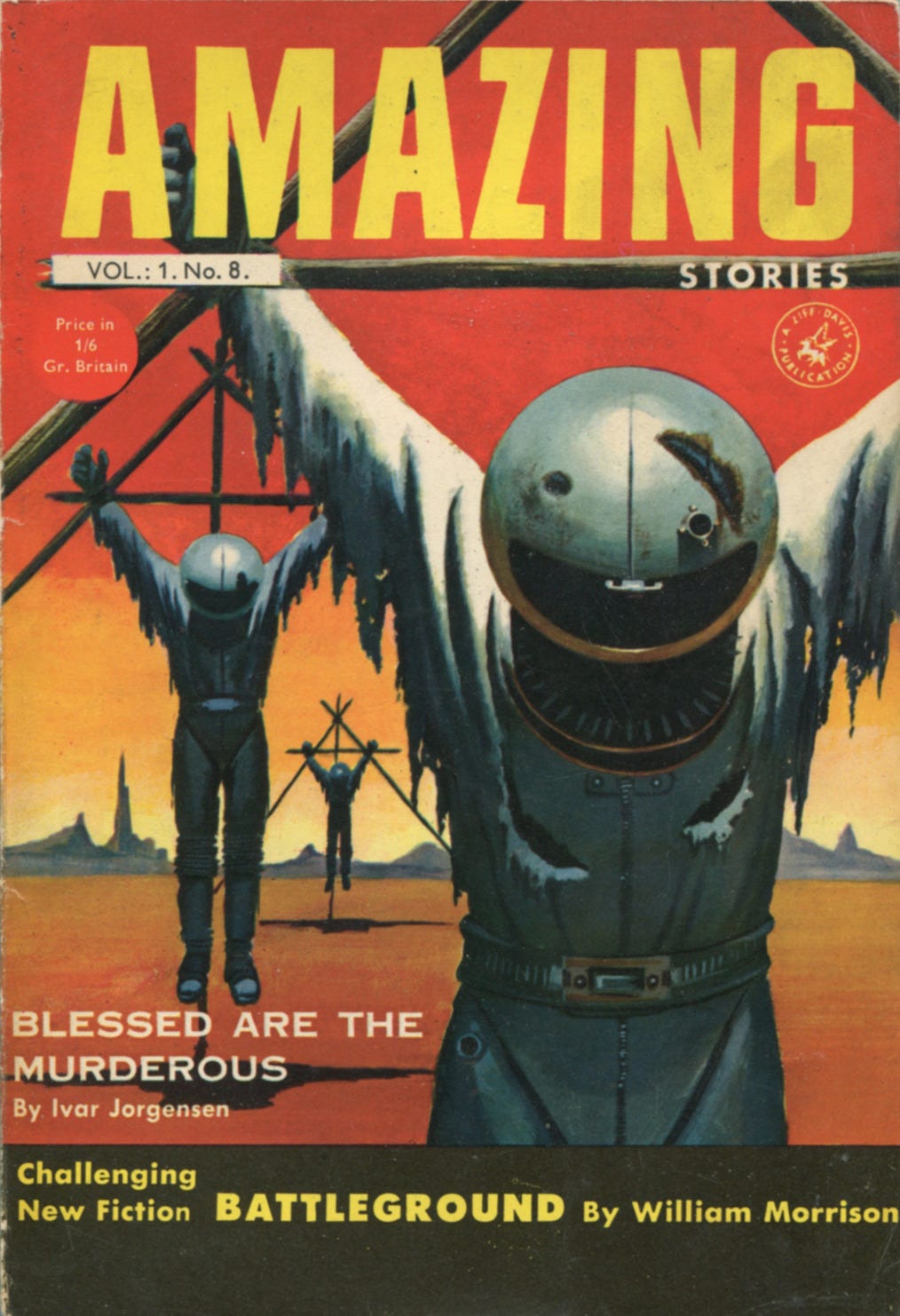 Then there’s this 1954 Amazing Stories cover by Ed Valigursky, under the "William Rembach" pseudonym. Perhaps not quite a crucifixion scene, since it could be more of a scarecrow deal. It does appear to be an illustration for the very unsubtly titled story “Blessed Are the Murderous.”