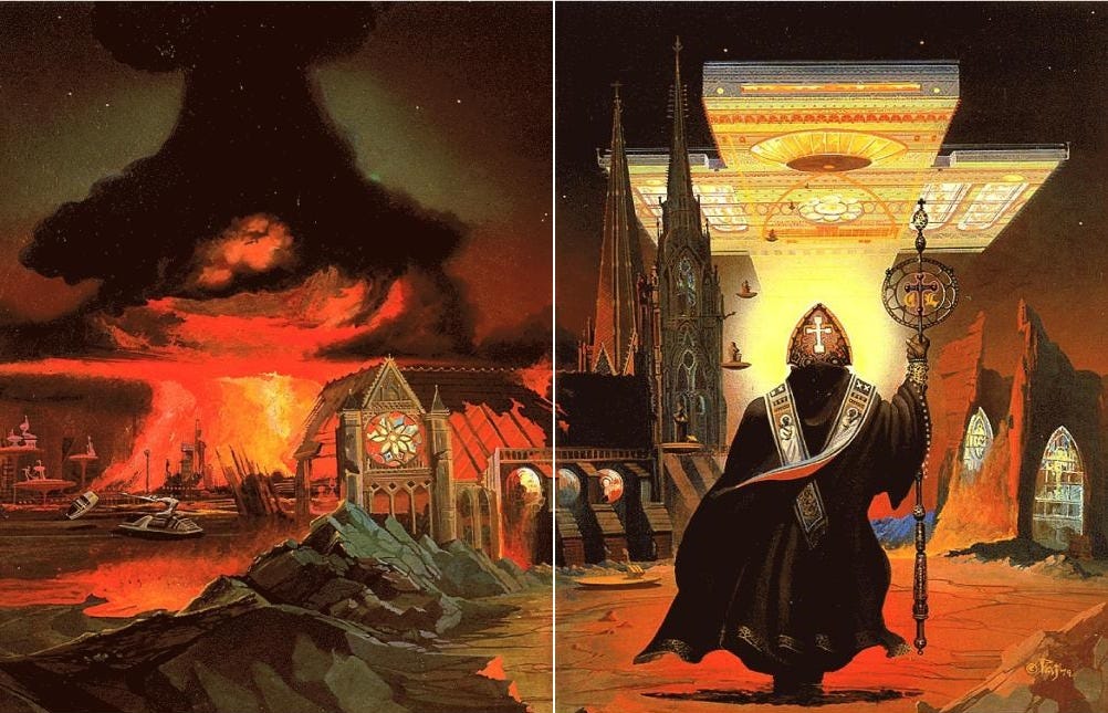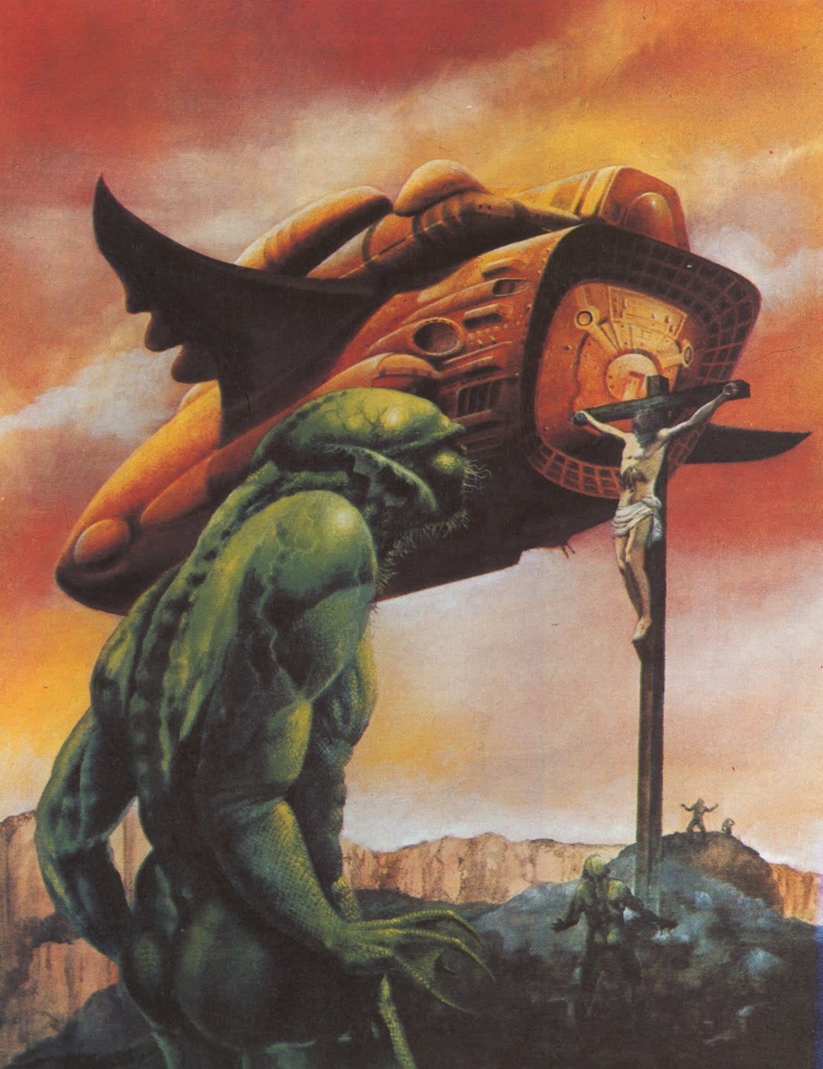 I usually try to post some holiday-themed sci-fi art on my blog, but I’m just as likely to forget. I thought I had a good run this Easter with this post, which paired up a giant pink space bunny with a lot of Easter Island-related UFO art. But today I realized that I missed a chance to talk about crucifixions and cross-related imagery, a more rich vein of sci-fi art.