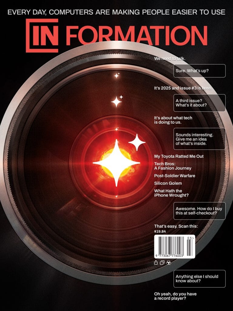 This post opens with some smart political analysis, but if you scroll halfway down, you'll find the real reason I'm sharing it: A look at a new revival of In Formation magazine, a tech-magazine-slash-art-installation with the unbeatable tagline of "Every day, computers are making people easier to use." The whole cover's great, too; check this out: