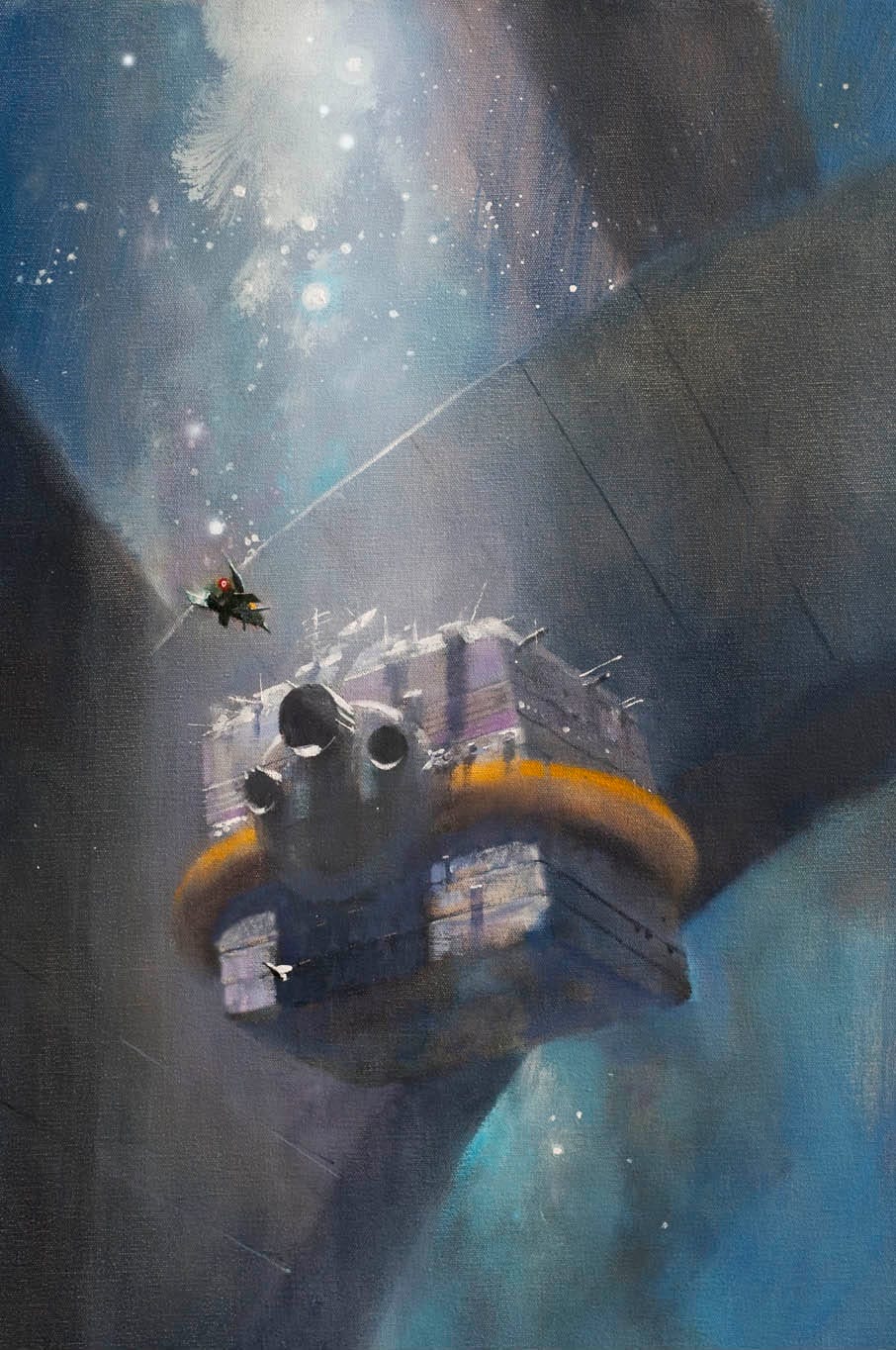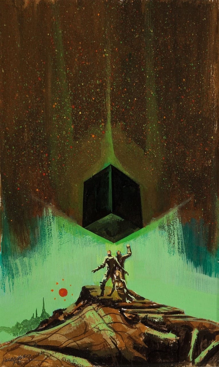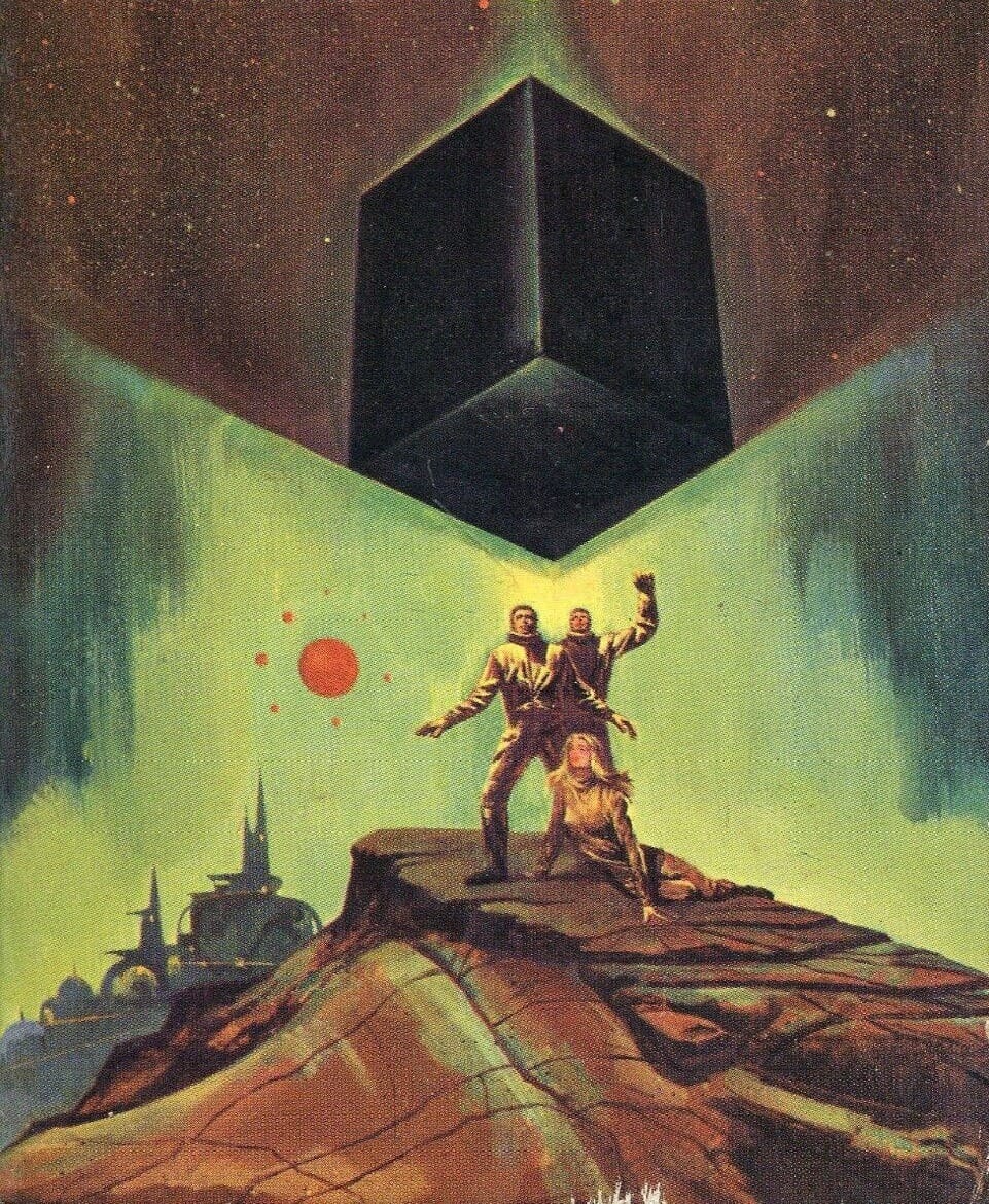 This post will be mostly surrealism – surrealists love a cube. That said, this 2016 John Harris cover to Mike Brooks' Dark Run is a perfectly representational spaceship cube. (And if you want more, there's always the Borg.)