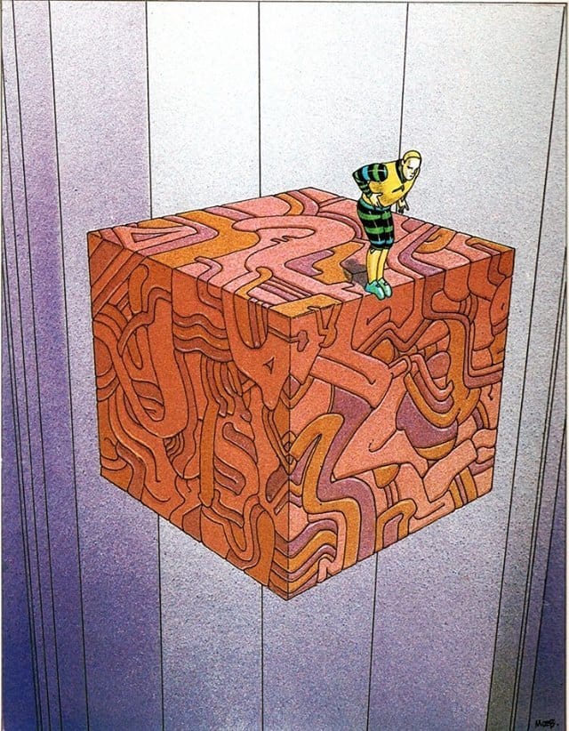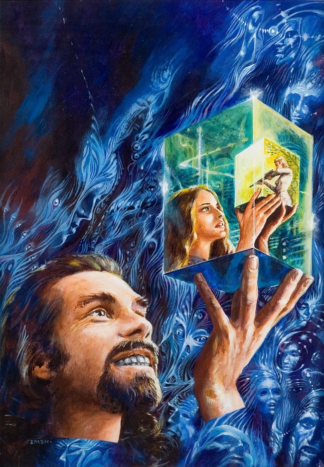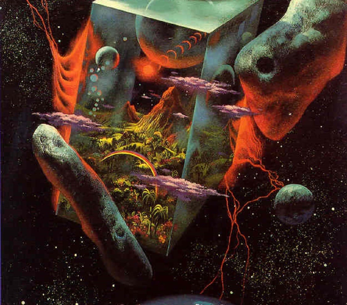 Don Dixon's 1987 cover to The Universe Between, by Alan E. Nourse, is a particularly flashy example of a surreal cube.