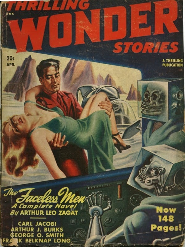 It reminds me a little of the avant-garde helmets sported by the skeletons on Earle Bergey’s April 1948 cover to Thrilling Wonder Stories.