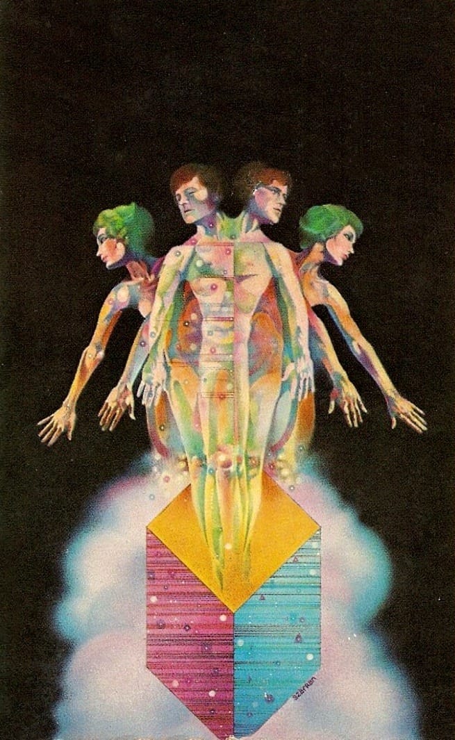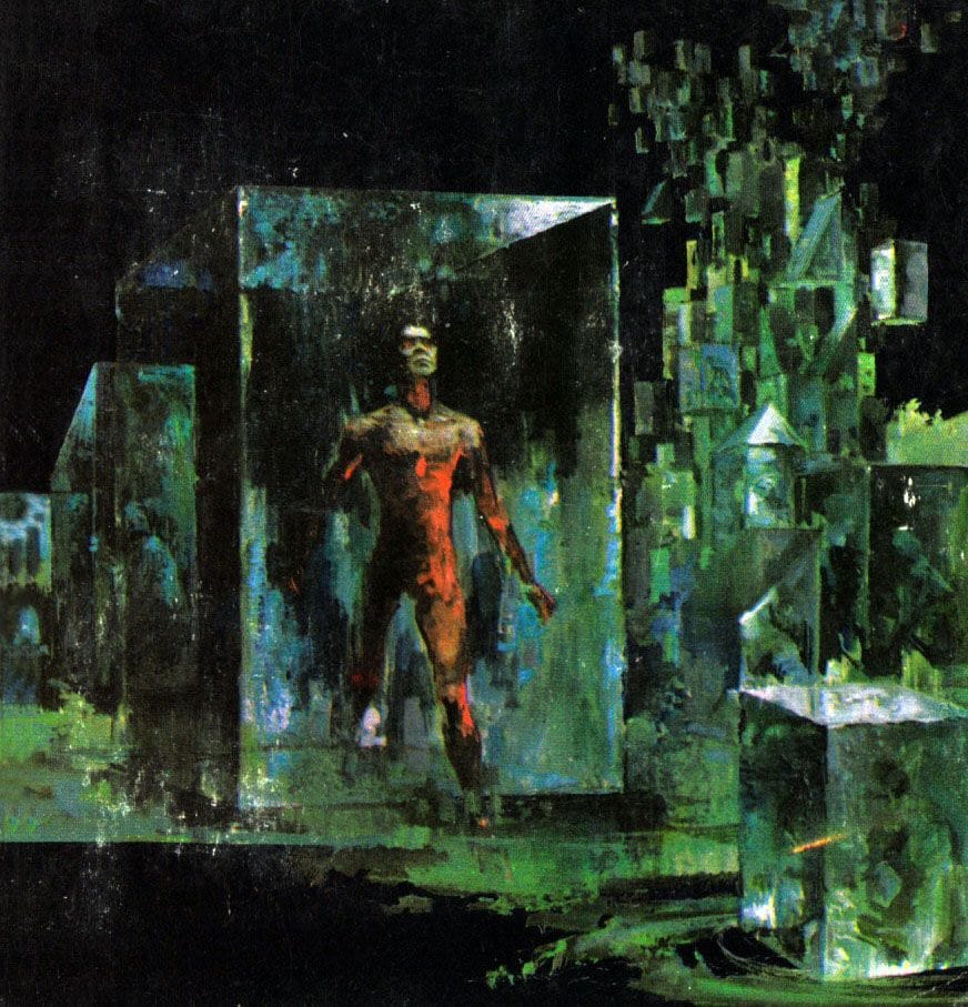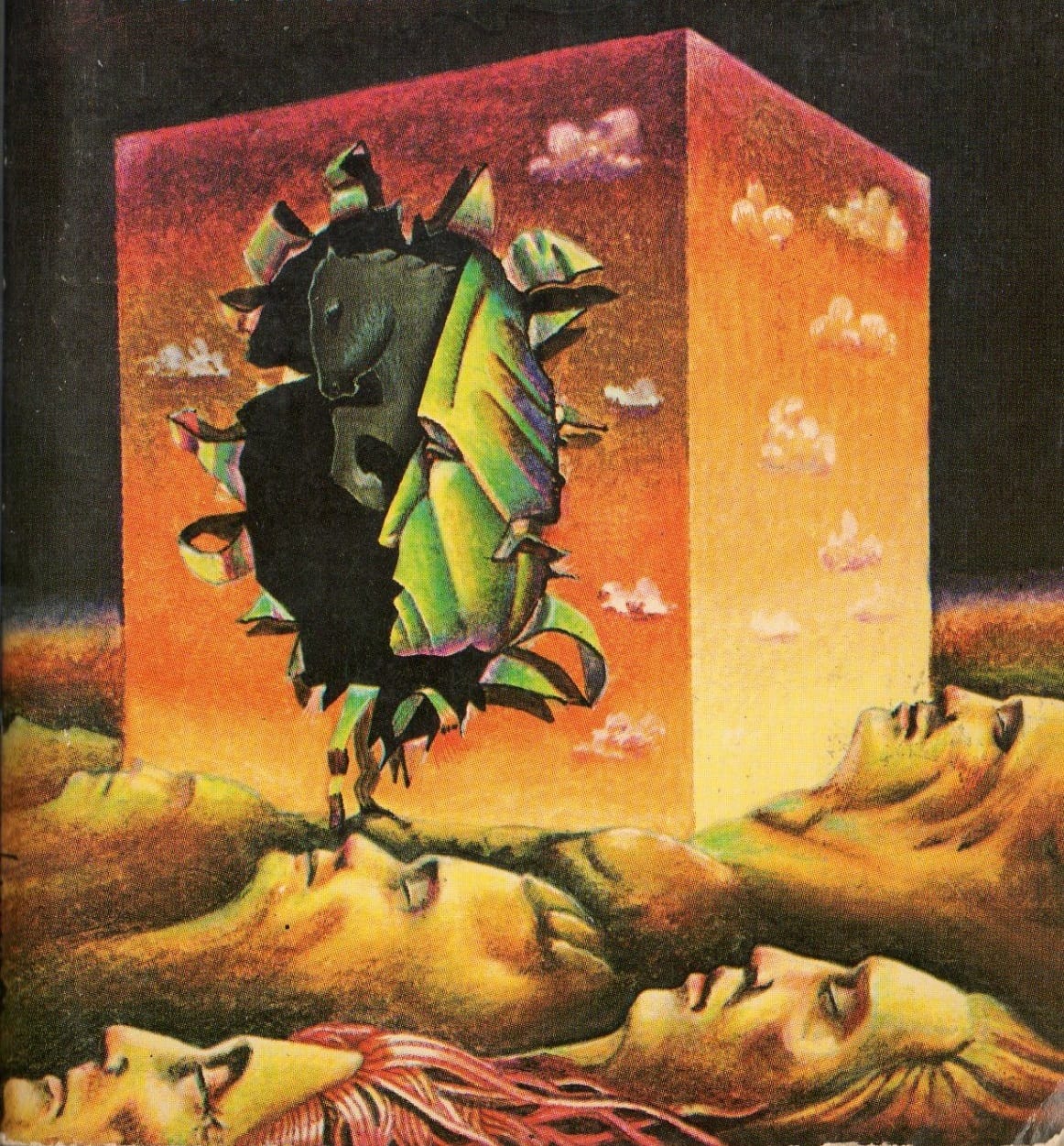 I'm not sure what the meaning behind the flattened cube on Gene Szafran's 1974 cover to Beyond Control, an anthology edited by Robert Silverberg, might be. It's certainly surreal.