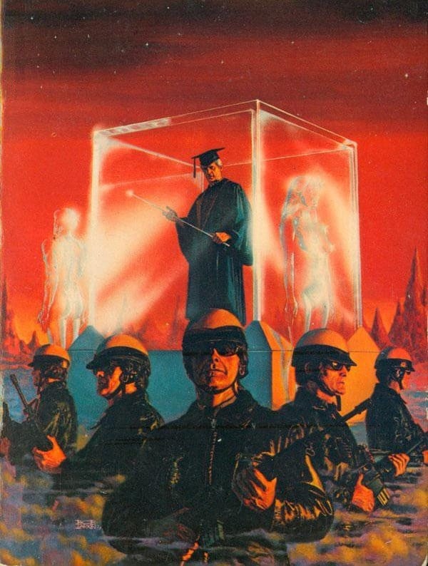 Bob Larkin's dystopian 1977 cover for James E. Gunn's Kampus puts a professor with a cattle prod inside a protective cube ringed by riot guards. What were the students protesting, future genocides?