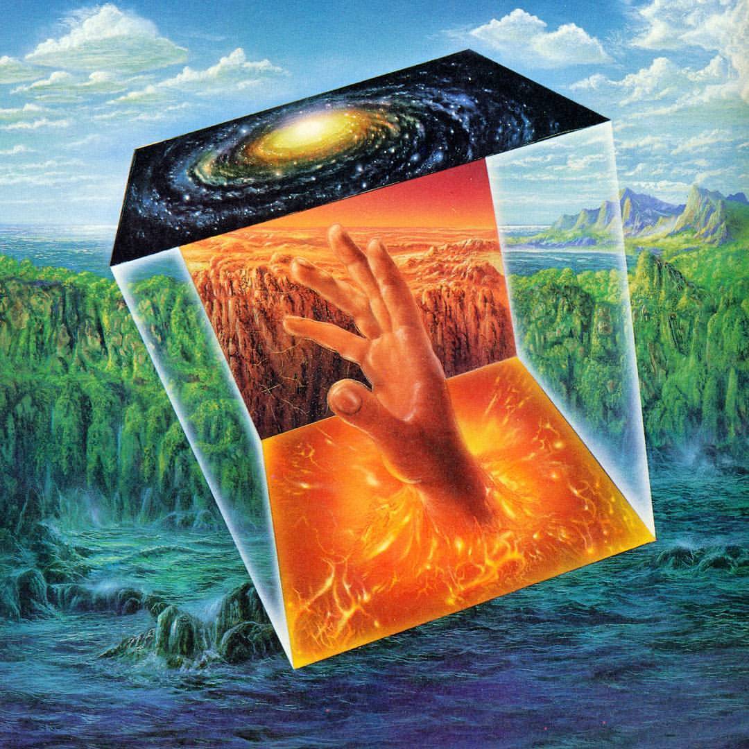 It appears to feature a surreal interpretation of the title, in the form of a glass cube containing life on Earth.