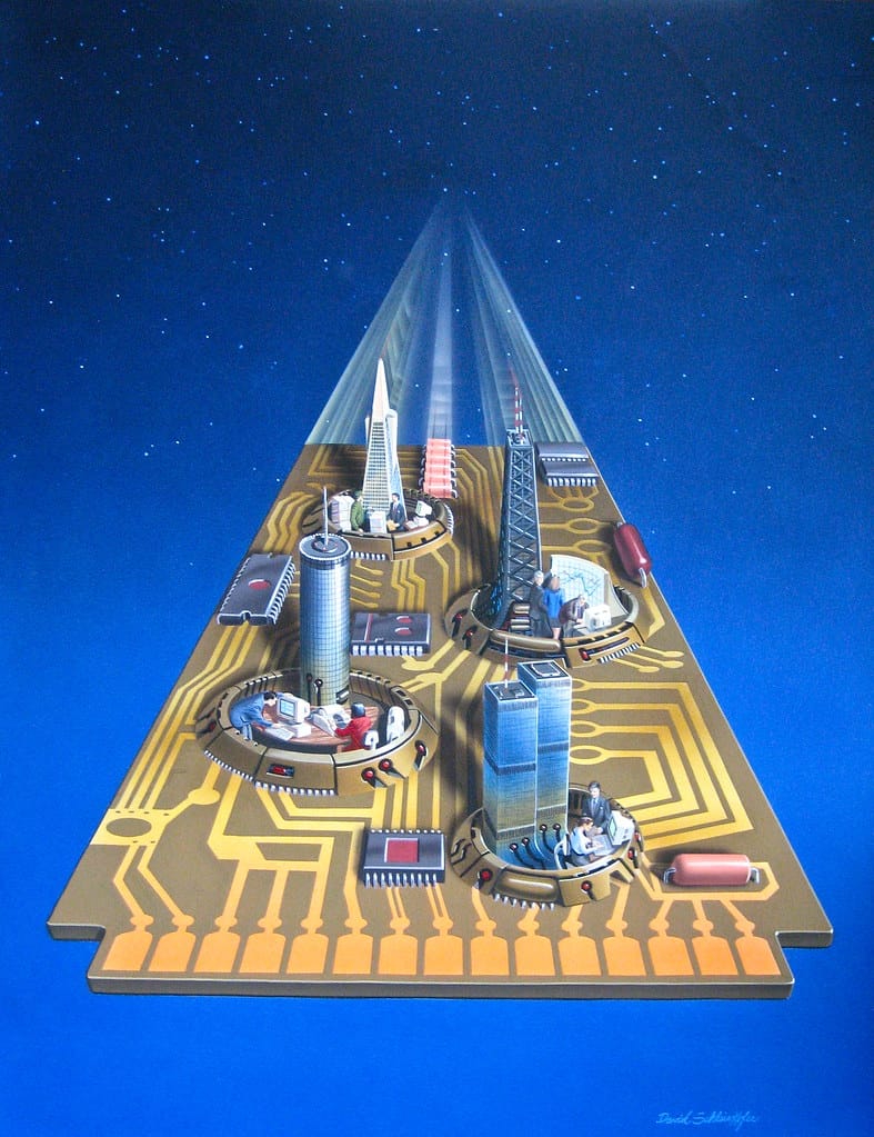 Schleinkofer did a lot of magazine illustrations. This particular one falls into the "technology surrealism" bucket that always reminds me of Robert Tinney and his work on Byte magazine, although Schleinkofer has a more detailed style.