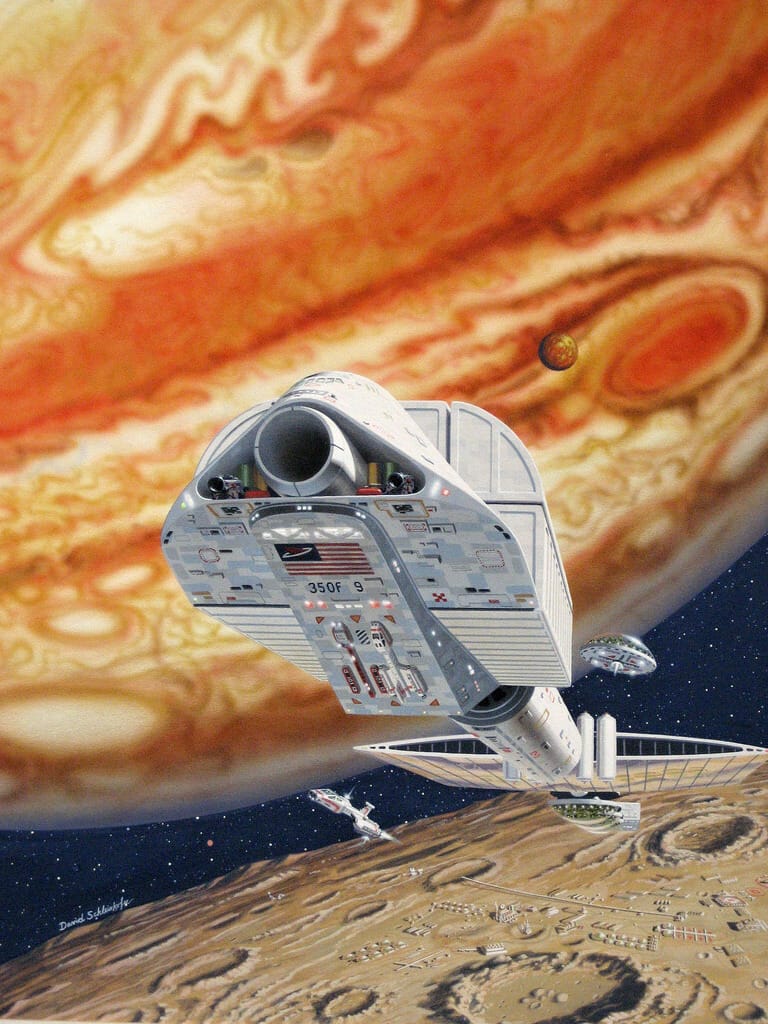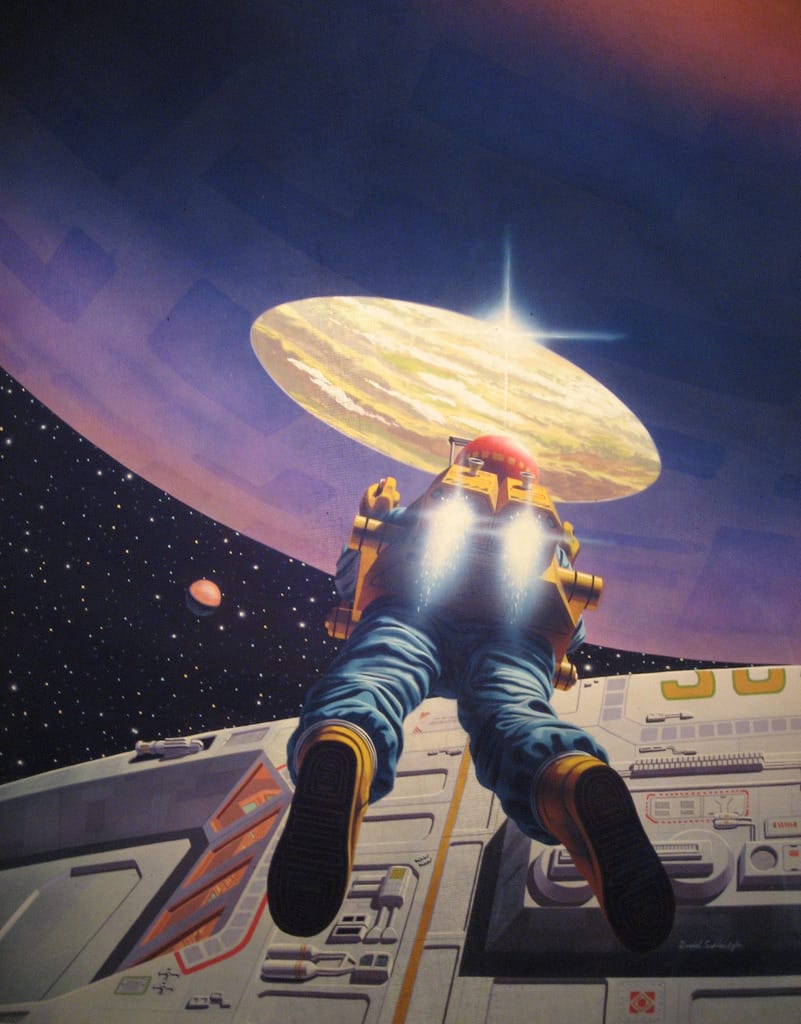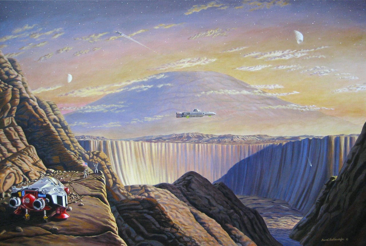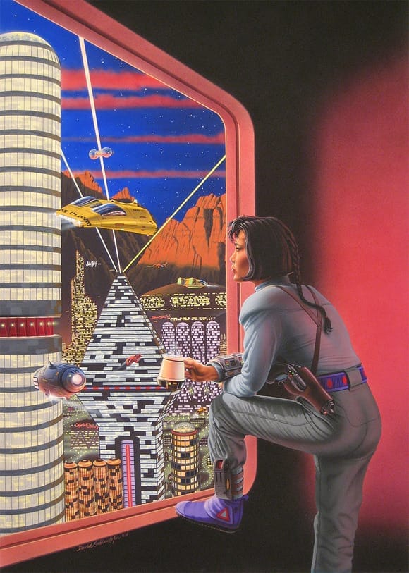 Schleinkofer had a lot of range, though: There's not much quiet human emotion in that Transformers battle! He completed plenty of more typical future-looking space art assignments, too.