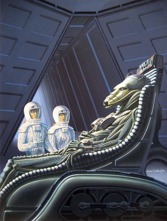Schleinkofer's detailed, vivid, airbrushed artwork stood out for its focus on humanity. Sometimes that means humans and their emotions are front and center, as in the explorers' horror at an alien encounter here –
