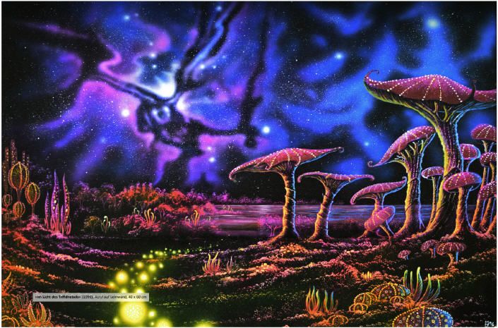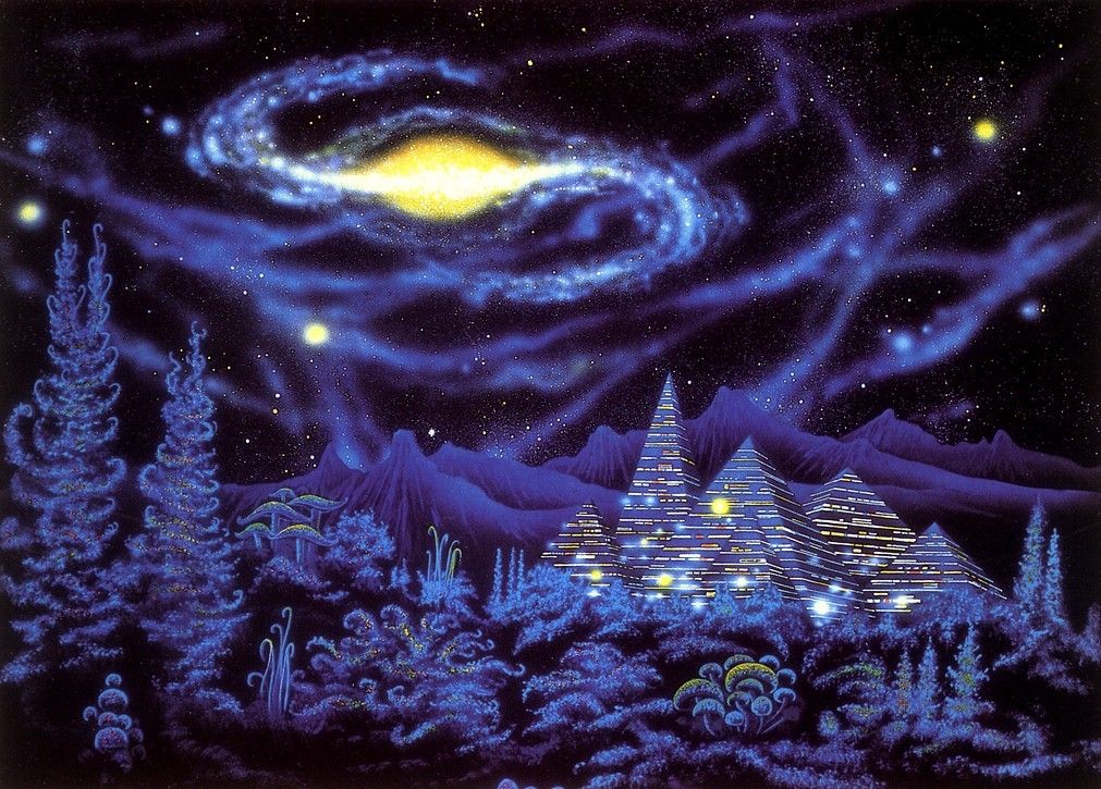 One work, Pyramidenstadt, brings a night to life with countless stars, glowing foliage, and the twinkling lights of a pyramid city.