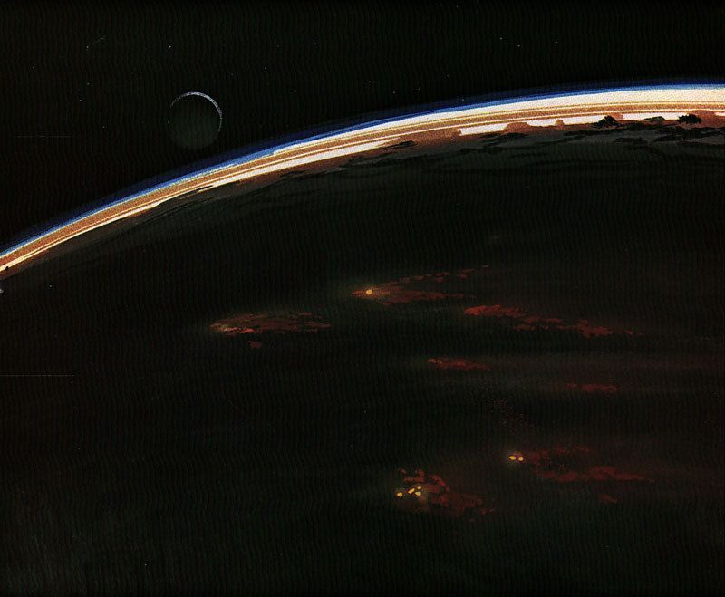 Perhaps this late-70s Battlestar Galactica concept art by Ralph McQuarrie points out why nighttime sci-fi art is rare: I love McQuarrie so much, but this particular piece strikes me as very muddy!