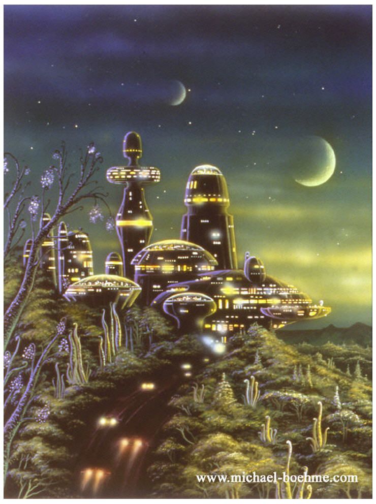Alien nights also justify flipping on the spaceship searchlights, increasing the exploratory mood, as in Chris Foss’s 1973 art for Isaac Asimov’s Earth Is Room Enough.